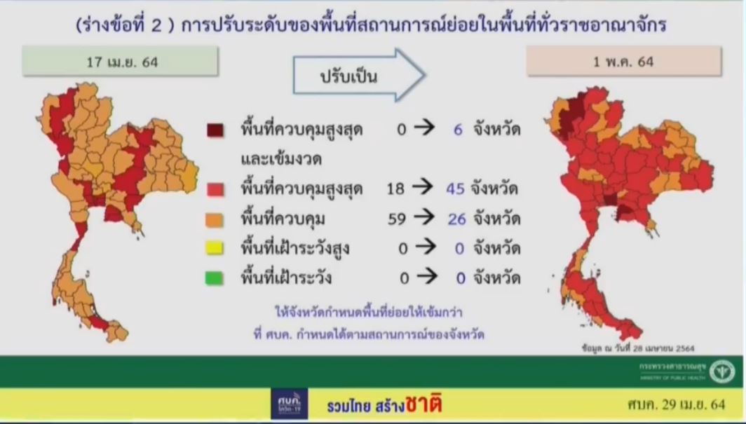 พื้นที่ควบคุมสูงสุด (สีแดง) เป็น 45 จังหวัด จาก 18 จังหวัด, พื้นที่ควบคุม (สีส้ม) เป็น 26 จังหวัด จาก 59 จังหวัด, พื้นที่เฝ้าระวังสูงสุด (สีเหลือง) และพื้นที่เฝ้าระวัง (สีเขียว) ไม่มี