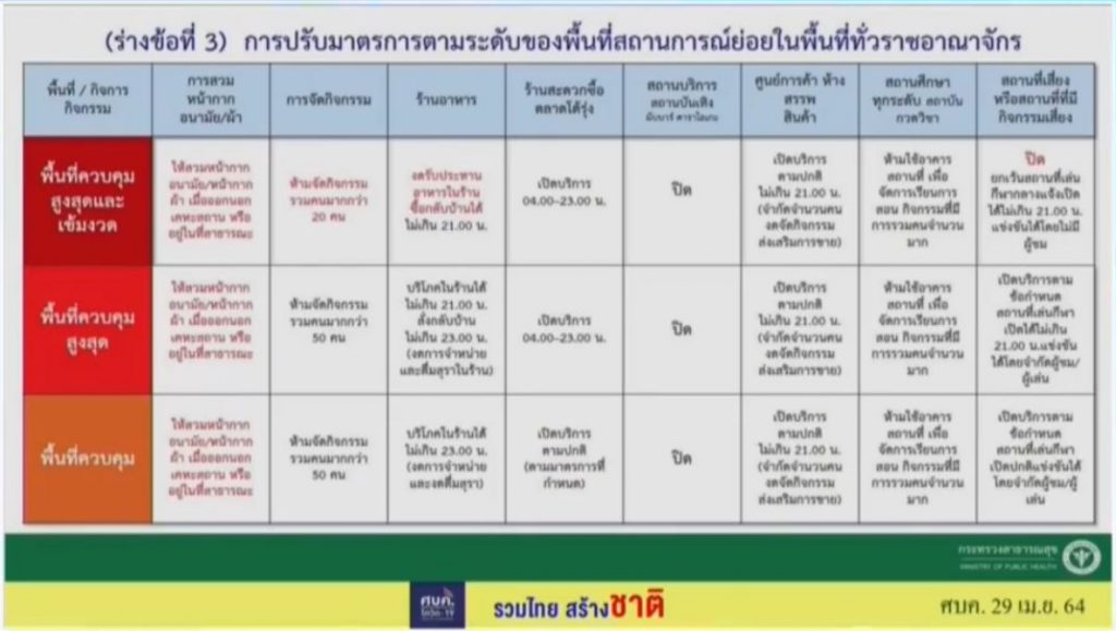 1.พื้นที่ควบคุมสูงสุดและเข้มงวด มีผู้ป่วยมากกว่า 100 รายต่อวัน ใน 1 สัปดาห์, พื้นที่ควบคุมสูงสุด มากกว่า 10 รายต่อวัน ใน 1 สัปดาห์