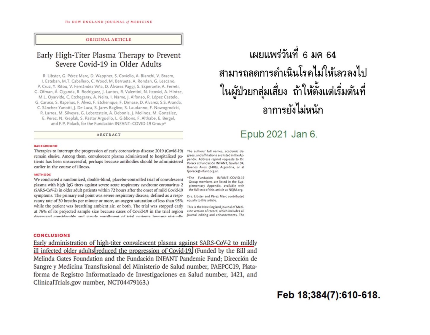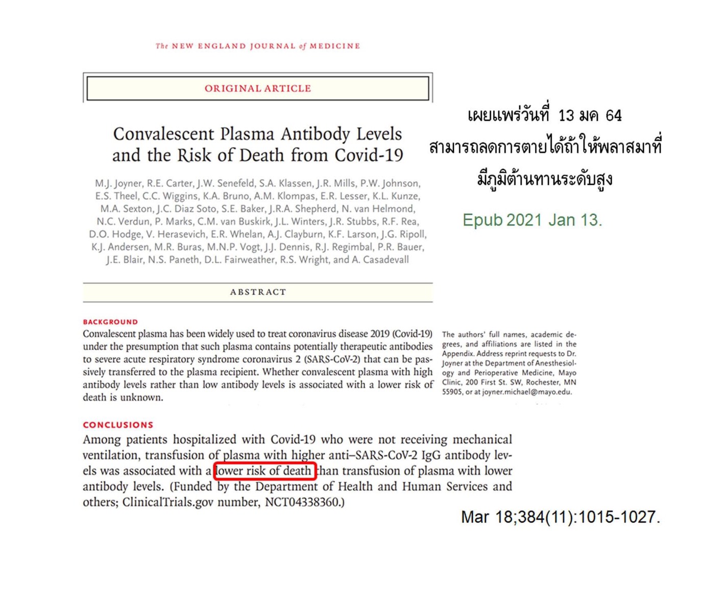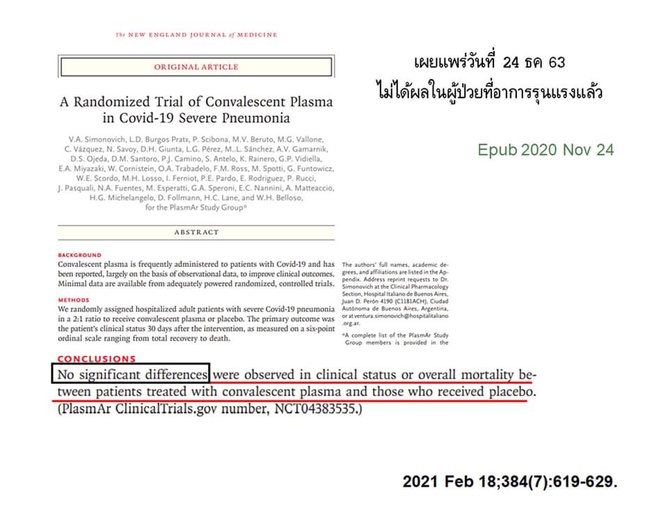 การใช้พลาสมารักษาผู้ป่วยโควิด มีการศึกษาชัดเจน ถ้าให้ในผู้ป่วยที่มีอาการรุนแรงแล้วจะไม่ได้ผล ตามเอกสารลงพิมม์ในวารสารอันดับหนึ่งของโลก New England Journal Medicine ในวันที่ 24 ธันวาคม 2563