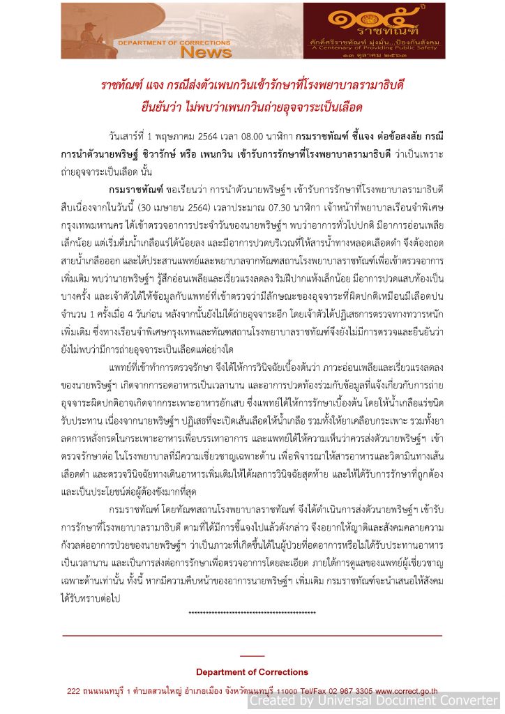 วันเสาร์ที่ 1 พฤษภาคม 2564 เวลา 08.00 น. กรมราชทัณฑ์ ชี้แจง ต่อข้อสงสัย กรณีการนำตัวนายพริษฐ์ ชิวารักษ์ หรือ เพนกวิน เข้ารับการรักษาที่โรงพยาบาลรามาธิบดี ว่าเป็นเพราะถ่ายอุจจาระเป็นเลือด นั้น