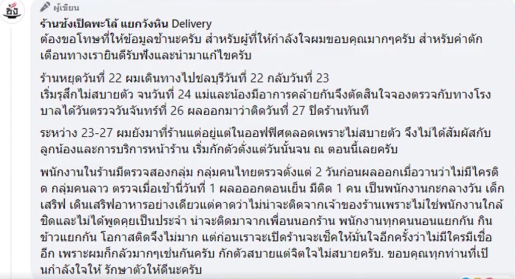 นอกจากนี้ ยังโพสต์ข้อความเพิ่มเติมว่า ต้องขอโทษที่ให้ข้อมูลช้านะครับ สำหรับผู้ที่ให้กำลังใจผมขอบคุณมากๆ ครับ สำหรับคำตักเตือนทางเรายินดีรับฟังและนำมาแก้ไขครับ ร้านหยุดวันที่ 22 ผมเดินทางไปชลบุรีวันที่ 22 กลับวันที่ 23 เริ่มรู้สึกไม่สบายตัว จนวันที่ 24 แม่และน้องมีอาการคล้ายกันจึงตัดสินใจจองตรวจกับทางโรงบาลได้วันตรวจวันจันทร์ที่ 26 ผลออกมาว่าติดวันที่ 27 ปิดร้านทันที