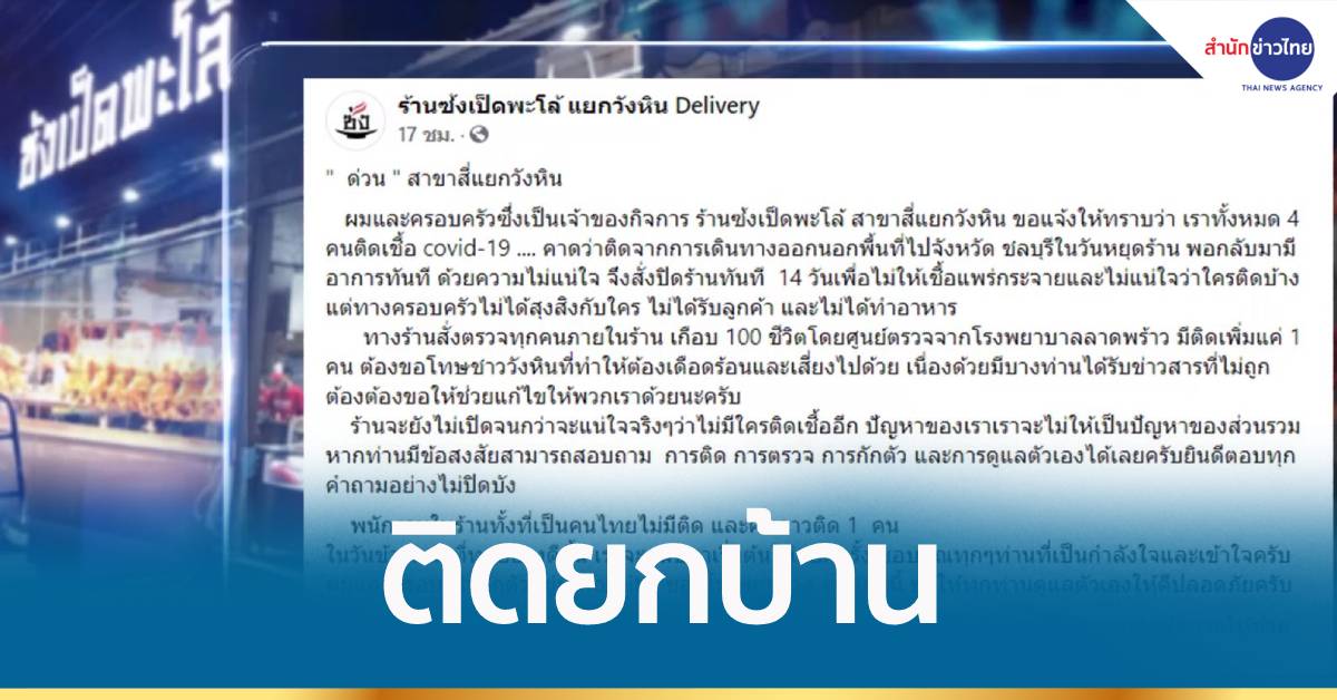 เมื่อวานนี้ (1 พ.ค.) เฟซบุ๊กเพจ “ร้านซ้งเป็ดพะโล้ แยกวังหิน Delivery” ได้โพสต์แจ้งว่า ครอบครัวของเจ้าของกิจการ ร้านซ้งเป็ดพะโล้ สาขาสี่แยกวังหิน ติดโควิดทั้งหมด 4 คน พร้อมแจงไทม์ไลน์
