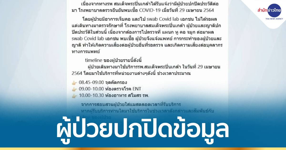 รพ.สมเด็จพระปิ่นเกล้า ออกประกาศแจ้งเตือนใจความว่า เนื่องจากทาง รพ.สมเด็จพระปิ่นเกล้า ได้รับแจ้งว่ามีผู้ป่วยปกปิดประวัติต่อมา โรงพยาบาลตรวจยืนยันพบเชื้อ COVID-19 เมื่อวันที่ 29 เมษายน 2564 โดยผู้ป่วยมีอาการเจ็บคอ และไป swab Covid lab เอกชน ไม่ได้รอผล แต่เดินทางมาตรวจรักษาที่โรงพยาบาลสมเด็จพระปิ่นเกล้า ผู้ป่วยและญาติปกปิดประวัติในส่วนนี้ เนื่องจากต้องการไปตรวจที่แผนก หู คอ จมูก ต่อมาผล swab Covid lab เอกชน พบเชื้อ ผู้ป่วยจึงแจ้งแพทย์ การกระทำของผู้ป่วยและญาติ ทำให้เกิดความเสี่ยงต่อผู้ป่วยอื่นที่รอตรวจ และเกิดความเสี่ยงต่อบุคลากรทางการแพทย์