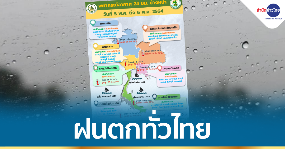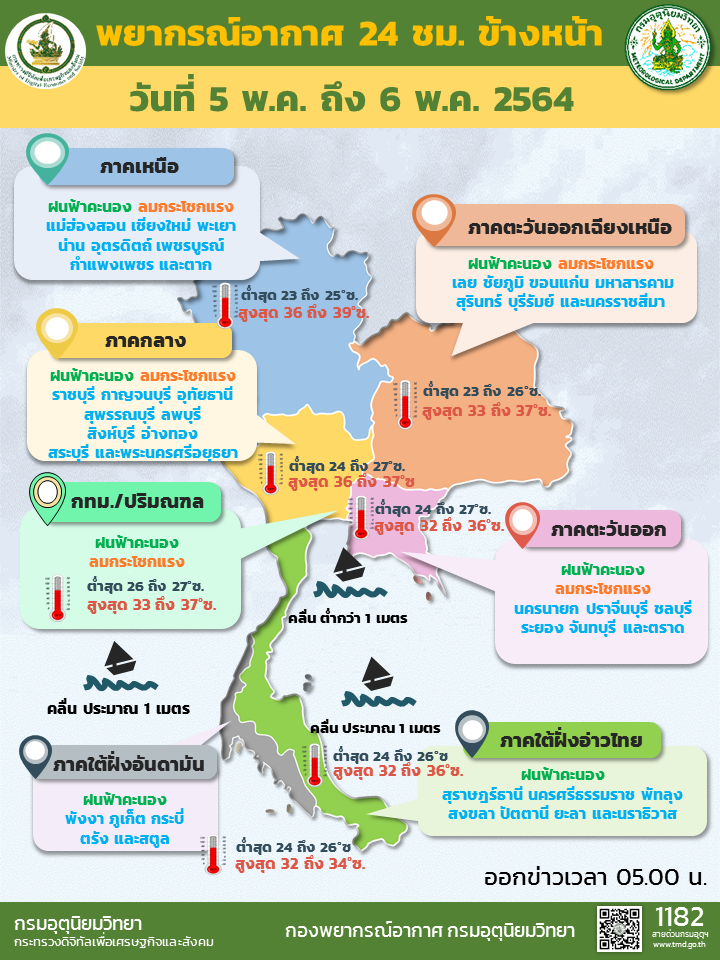 กรมอุตุนิยมวิทยา พยากรณ์อากาศ 24 ชั่วโมงข้างหน้า บริเวณความกดอากาศสูงหรือมวลอากาศเย็นอีกระลอกหนึ่งจากประเทศจีนได้แผ่ลงมาปกคลุมประเทศจีนตอนใต้และประเทศเวียดนามตอนบนแล้ว คาดว่าจะแผ่ลงมาปกคลุมภาคตะวันออกเฉียงเหนือตอนบนของประเทศไทย และทะเลจีนใต้ในวันนี้ (5 พ.ค.64) ซึ่งจะส่งผลทำให้มีลมใต้และลมตะวันออกเฉียงใต้พัดนำความชื้นจากทะเลจีนใต้และอ่าวไทยเข้ามาปกคลุมบริเวณภาคเหนือตอนล่าง ภาคตะวันออกเฉียงเหนือ ภาคกลาง และภาคตะวันออก รวมทั้งกรุงเทพมหานครและปริมณฑล ในขณะที่ประเทศไทยตอนบนมีอากาศร้อน