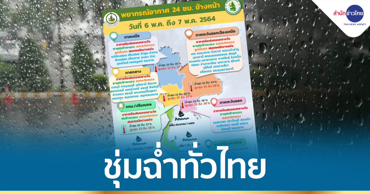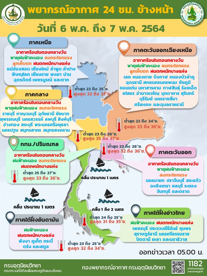กรุงเทพฯ 6 พ.ค.-กรมอุตุฯ เตือนฝนฟ้าคะนอง-ลมกระโชกแรงทั่วไทย เหนือ-อีสาน ระวังลูกเห็บตก ส่วน กทม.-ปริมณฑล อากาศร้อนตอนกลางวัน กับมีฝนฟ้าคะนอง 60% ของพื้นที่