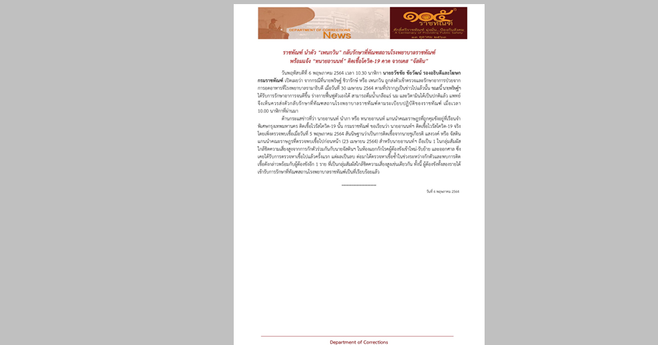 กรมราชทัณฑ์ 6 พ.ค.-ราชทัณฑ์ เผย “อานนท์ นำภา” ติดโควิด-19 พร้อม แจ้งนำตัว “เพนกวิน” กลับมารักษาที่ทัณฑสถานโรงพยาบาลราชทัณฑ์ แล้ว