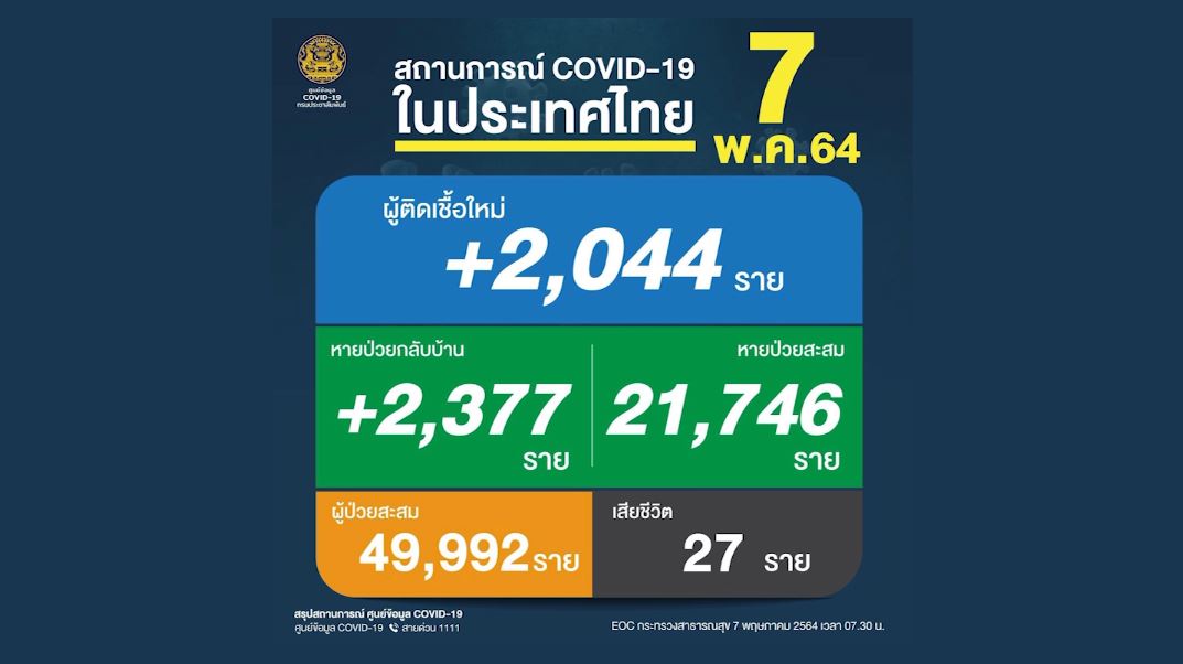ศูนย์ข้อมูล Covid-19 รายงานพบผู้ติดเชื้อใหม่ 2,044 คน ทำให้ยอดสะสมเพิ่มเป็น 49,992 คน อย่างไรก็ตาม ล่าสุดมีผู้ที่หายป่วยกลับบ้านได้แล้ว 2,377 คน ทำให้มียอดผู้หายป่วยสะสมอยู่ที่ 21,746 คน อย่างไรก็ตาม ปรากฏว่ายอดผู้เสียชีวิตในวันนี้ (7 พ.ค.) มากถึง 27 ราย-สำนักข่าวไทย