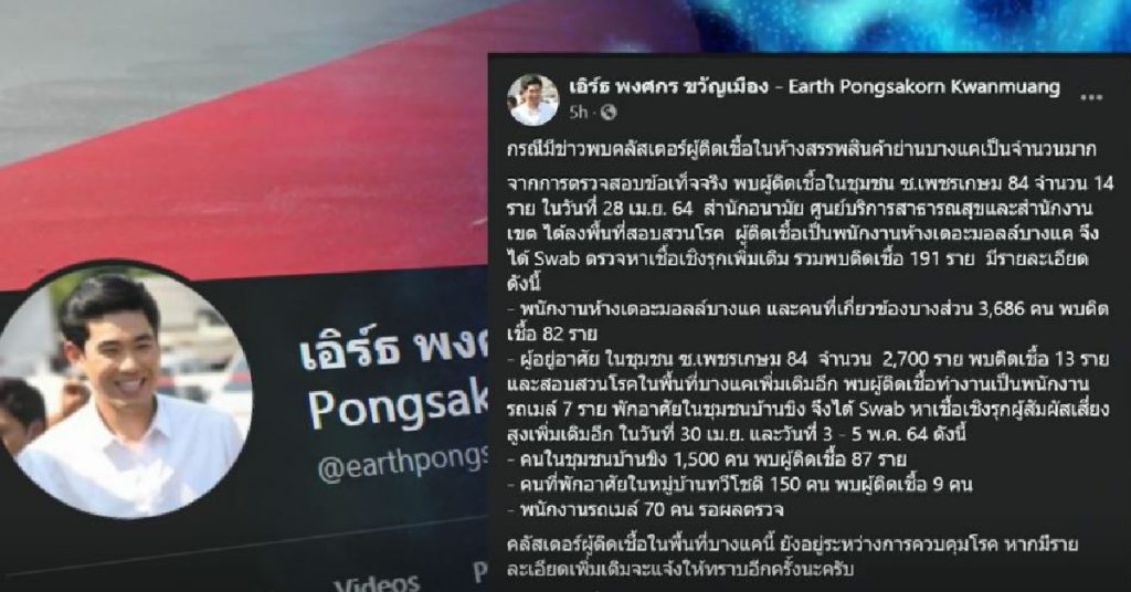 ร.ต.อ.พงศกร ขวัญเมือง โฆษกกรุงเทพมหานคร โพสต์เฟซบุ๊กกรณีมีข่าวพบคลัสเตอร์ผู้ติดเชื้อโควิด-19 ในห้างสรรพสินค้าย่านบางแคเป็นจำนวนมากว่า จากการตรวจสอบข้อเท็จจริงพบผู้ติดเชื้อในชุมชน ซ.เพชรเกษม 84 จำนวน 14 ราย ในวันที่ 28 เม.ย. 64 ศูนย์บริการสาธารณสุขและสำนักงานเขตได้ลงพื้นที่ลงพื้นที่สอบสวนโรค ผู้ติดเชื้อเป็นพนักงานห้างเดอะมอลล์ บางแค จึงได้ Swab ตรวจหาเชื้อเชิงรุกเพิ่มเติม รวมพบติดเชื้อเพิ่ม 191 ราย