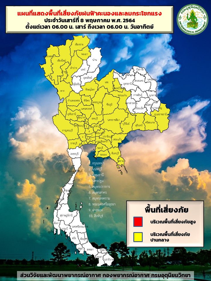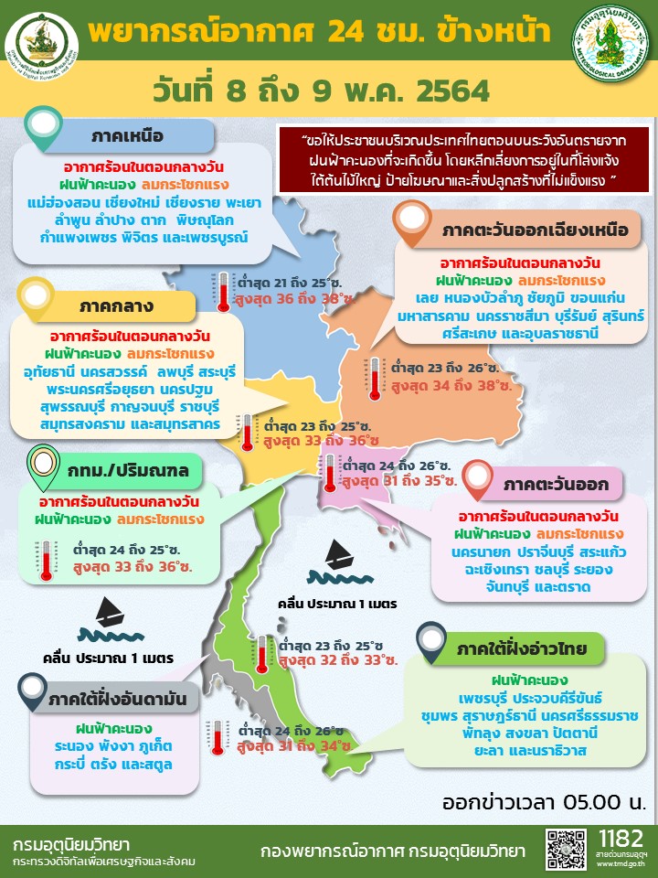 กรมอุตุนิยมวิทยาพยากรณ์อากาศ 24 ชั่วโมงข้างหน้า บริเวณความกดอากาศสูงหรือมวลอากาศเย็นจากประเทศจีนที่ปกคลุมประเทศไทยตอนบนและทะเลจีนใต้เริ่มมีกำลังอ่อนลง ลักษณะเช่นนี้จะทำให้ประเทศไทยตอนบนมีอุณหภูมิสูงขึ้น โดยมีอากาศร้อนในตอนกลางวัน ในขณะที่ลมใต้และลมตะวันออกเฉียงใต้ยังคงพัดนำความชื้นจากทะเลจีนใต้และอ่าวไทยเข้ามาปกคลุมภาคเหนือตอนล่าง ภาคตะวันออกเฉียงเหนือ ภาคกลาง และภาคตะวันออก รวมทั้งกรุงเทพมหานครและปริมณฑล ทำให้บริเวณดังกล่าวยังคงมีฝนฟ้าคะนองกับมีลมกระโชกแรงเกิดขึ้นบางพื้นที่ ขอให้ประชาชนบริเวณประเทศไทยตอนบนระวังอันตรายจากฝนฟ้าคะนองและลมกระโชกแรงที่จะเกิดขึ้นไว้ด้วย โดยหลีกเลี่ยงการอยู่ในที่โล่งแจ้ง ใต้ต้นไม้ใหญ่ ป้ายโฆษณา และสิ่งปลูกสร้างที่ไม่แข็งแรง สำหรับเกษตรกรควรเตรียมการป้องกันและระวังความเสียหายที่จะเกิดต่อผลผลิตทางการเกษตรไว้ด้วย สำหรับลมตะวันออกที่พัดปกคลุมอ่าวไทย ภาคใต้ และทะเลอันดามัน มีกำลังอ่อนลง ทำให้ภาคใต้มีฝนลดลง