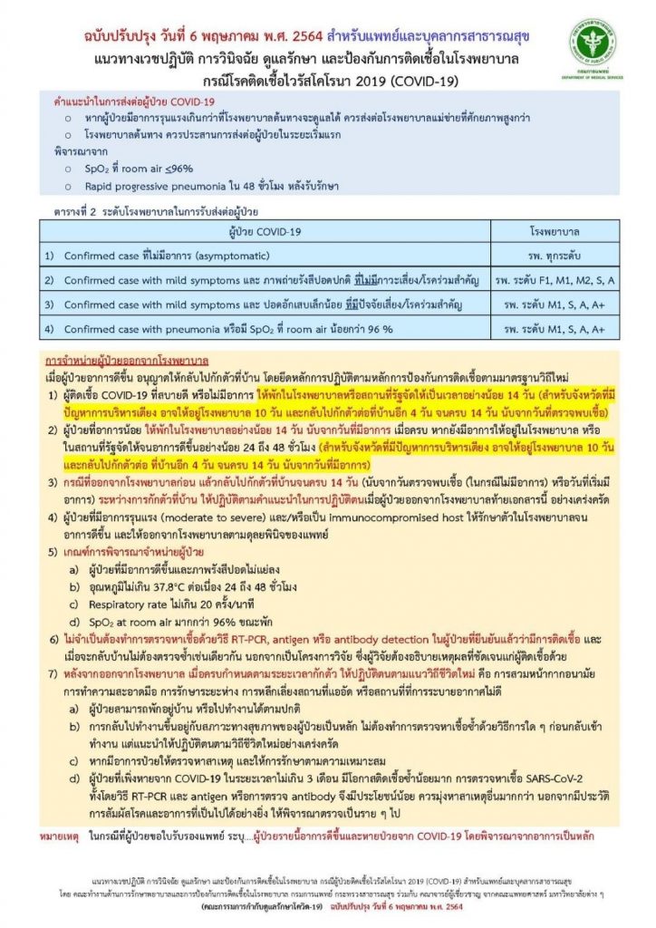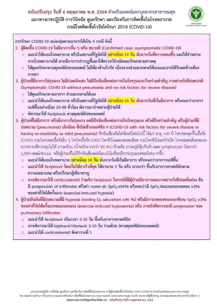 สำหรับแนวทางเวชปฏิบัติ การรักษาผู้ป่วยโควิด -19 แบ่งออกเป็น 4 กรณี ได้แก่ 1. ผู้ติดเชื้อโควิด ไม่มีอาการอื่น หรือสบายดี แนะนำให้นอนรพ.หรือ สถานที่รัฐจัดให้ อย่างน้อย 14วันนับตั้งแต่วันที่ตรวจพบเชื้อ และให้จำหน่าย จากโรงพยาบาลได้ หากมีอาการปรากฎขึ้นมาให้ตรวจวินิจฉัยและรักษาตามสาเหตุ ดูแลรักษาตามดุลยพินิจของแพทย์ ไม่ให้ยาต้านไวรัส เนื่องจากส่วนมากหายได้เองและอาจได้รับผลข้างเคียงจากยา