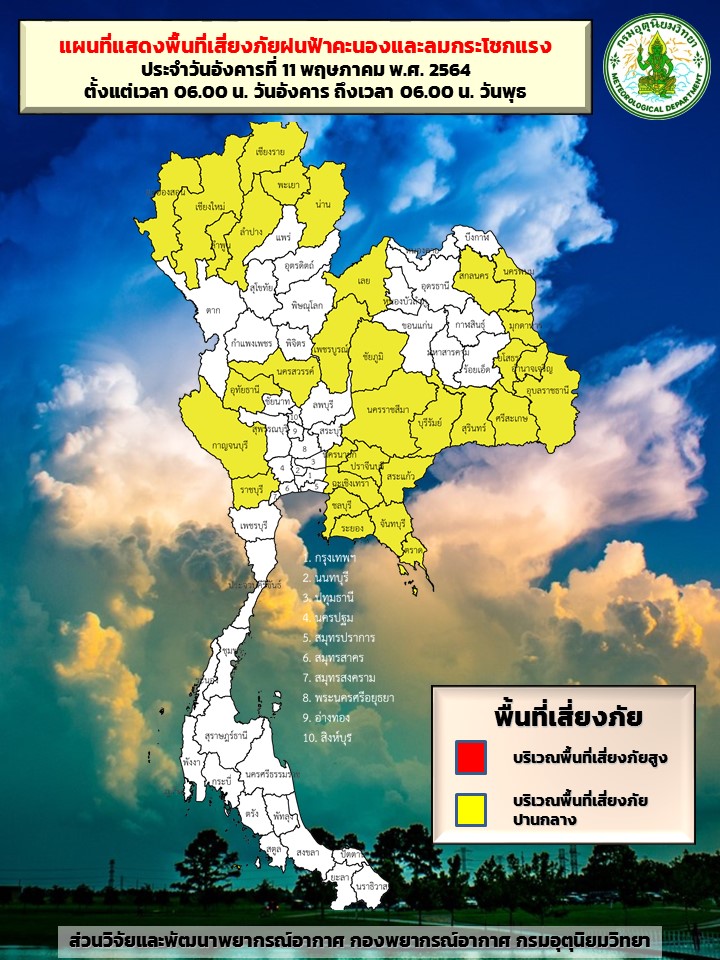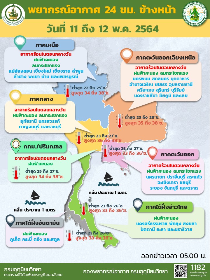 กรมอุตุฯ 11 พ.ค. – กรมอุตุฯ เผยไทยตอนบน รวมทั้งกรุงเทพฯ และปริมณฑล อากาศร้อนในตอนกลางวัน กับมีฝนฟ้าคะนองและลมกระโชกแรงบางพื้นที่