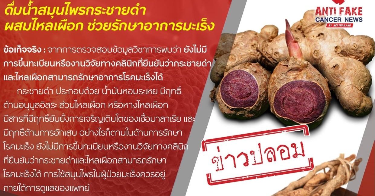 สถาบันมะเร็งฯ 11พ.ค.-สถาบันมะเร็งฯ แจ้งเตือนข่าวปลอม“ น้ำสมุนไพรกระชายดำและไหลเผือก ช่วยแก้ริดสีดวงจมูกและทวาร ผู้มีอาการมะเร็ง” หลังมีกระแสข่าวทางสื่อออนไลน์ ตรวจสอบข้อเท็จจริง พบยังไม่มีการขึ้นทะเบียน หรืองานวิจัยทางคลินิกที่ยืนยันว่าสามารถรักษาอาการมะเร็งได้