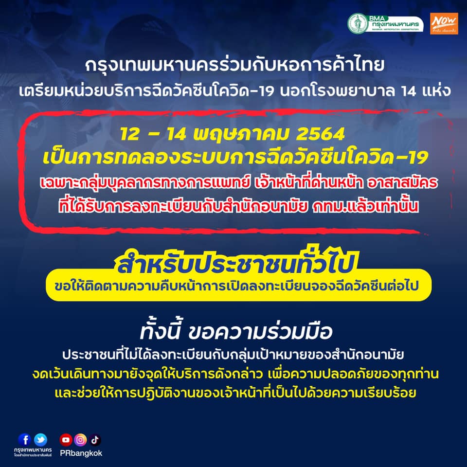 กทม. 11พ.ค.-ดีเดย์ 12-14 พฤษภาคม กทม.ร่วมหอการค้าไทย จัดหน่วยบริการฉีดวัคซีนโควิดนอก รพ.14 แห่งเฉพาะกลุ่มบุคลากรทางการแพทย์ เจ้าหน้าที่ด่านหน้าอาสาสมัครที่ลงทะเบียนกับสำนักอนามัย กทม.