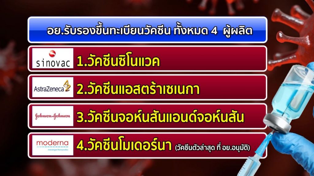 ล่าสุด เมื่อวานนี้ อย.ขึ้นทะเบียนรับรองวัคซีน COVID-19 ของ “โมเดอร์นา” แล้ว ถือเป็นวัคซีนรายที่ 4 ต่อจากแอสตราเซเนกา ซิโนแวค และจอห์นสัน แอนด์ จอห์นสัน