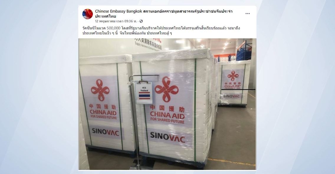 กรุงเทพฯ 14 พ.ค.- วันนี้ วัคซีนซิโนแวค จำนวน 500,000 โดส ถึงประเทศไทย เป็นวัคซีนการบริจาคจากประเทศจีน