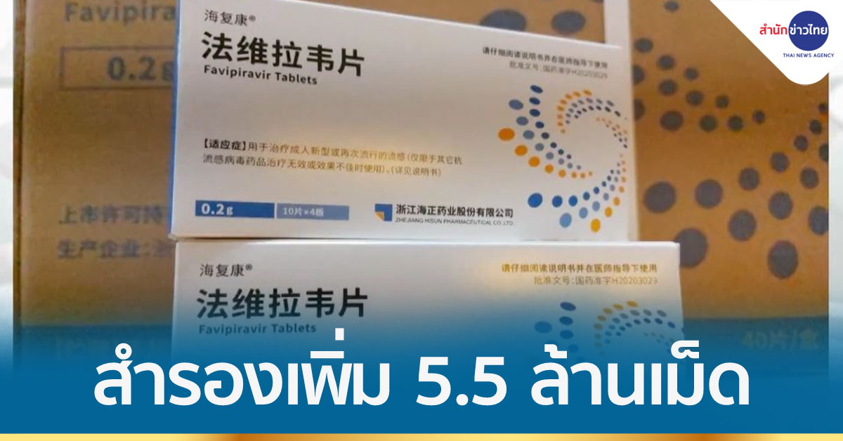 องค์การเภสัชกรรมเพิ่มการสำรองยาฟาวิพิราเวียร์อีก 5.5 ล้านเม็ด โดยวันนี้ยาสำรองมาถึงคลังยาองค์การเภสัชกรรม 3 ล้านเม็ด และวันที่ 17 พ.ค. เพิ่มอีก 2.5 ล้านเม็ด ซึ่งจะจัดเก็บสำรองไว้ที่คลังยาขององค์การเภสัชกรรม อำเภอบางเสาธง จังหวัดสมุทรปราการ เพื่อกระจายยาไปสำรองในสถานพยาบาลตามพื้นที่ต่างๆ ทั่วประเทศต่อไป ให้ผู้ป่วยสามารถเข้าถึงยา มีใช้อย่างต่อเนื่อง และรักษาได้ทันท่วงที