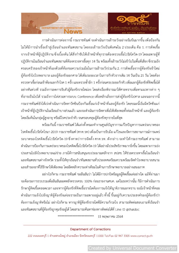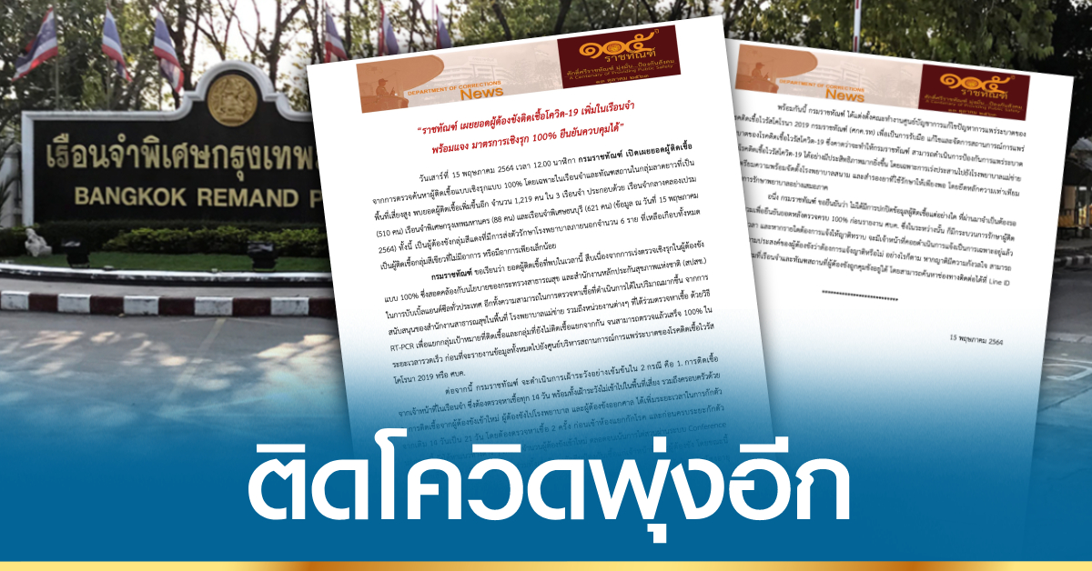 อนึ่ง กรมราชทัณฑ์ ขอยืนยันว่า ไม่ได้มีการปกปิดข้อมูลผู้ติดเชื้อแต่อย่างใด ที่ผ่านมาจำเป็นต้องรอการรวบรวมเพื่อยืนยันยอดหลังตรวจครบ 100% ก่อนรายงาน ศบค. ซึ่งในระหว่างนั้นก็มีกระบวนการรักษาผู้ติดเชื้อตลอดเวลา และหากรายใดต้องการแจ้งให้ญาติทราบ จะมีเจ้าหน้าที่คอยดำเนินการแจ้งเป็นการเฉพาะอยู่แล้ว ขึ้นอยู่กับความประสงค์ของผู้ต้องขังว่าต้องการแจ้งญาติหรือไม่ อย่างไรก็ตาม หากญาติมีความกังวลใจ สามารถติดต่อสอบถามที่เรือนจำและทัณฑสถานที่ผู้ต้องขังถูกคุมขังอยู่ได้ โดยสามารถค้นหาช่องทางติดต่อได้ที่ Line ID @thaidoc. – สำนักข่าวไทย