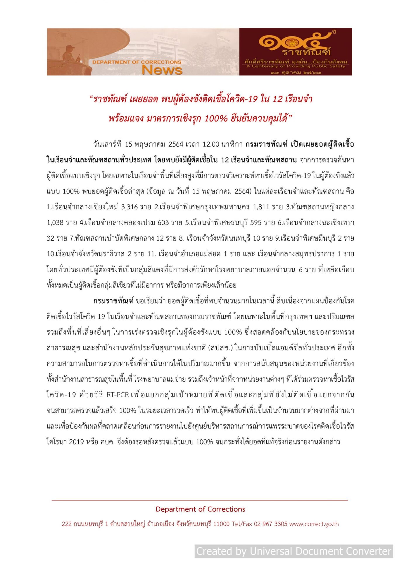 วันเสาร์ที่ 15 พฤษภาคม 2564 เวลา 12.00 น. กรมราชทัณฑ์ เปิดเผยยอดผู้ติดเชื้อโควิด-19 จากการตรวจค้นหาผู้ติดเชื้อแบบเชิงรุก 100% โดยเฉพาะในเรือนจำและทัณฑสถานในกลุ่มลาดยาว ซึ่งเป็นพื้นที่เสี่ยงสูง พบยอดผู้ติดเชื้อเพิ่มขึ้นอีก จำนวน 1,219 คน ใน 3 เรือนจำ ประกอบด้วย เรือนจำกลางคลองเปรม (510 คน) เรือนจำพิเศษกรุงเทพมหานคร (88 คน) และเรือนจำพิเศษธนบุรี (621 คน) (ข้อมูล ณ วันที่ 15 พฤษภาคม 2564) ทั้งนี้ เป็นผู้ต้องขังกลุ่มสีแดงที่มีการส่งตัวรักษาโรงพยาบาลภายนอก จำนวน 6 ราย ที่เหลือเกือบทั้งหมดเป็นผู้ติดเชื้อกลุ่มสีเขียวที่ไม่มีอาการ หรือมีอาการเพียงเล็กน้อย