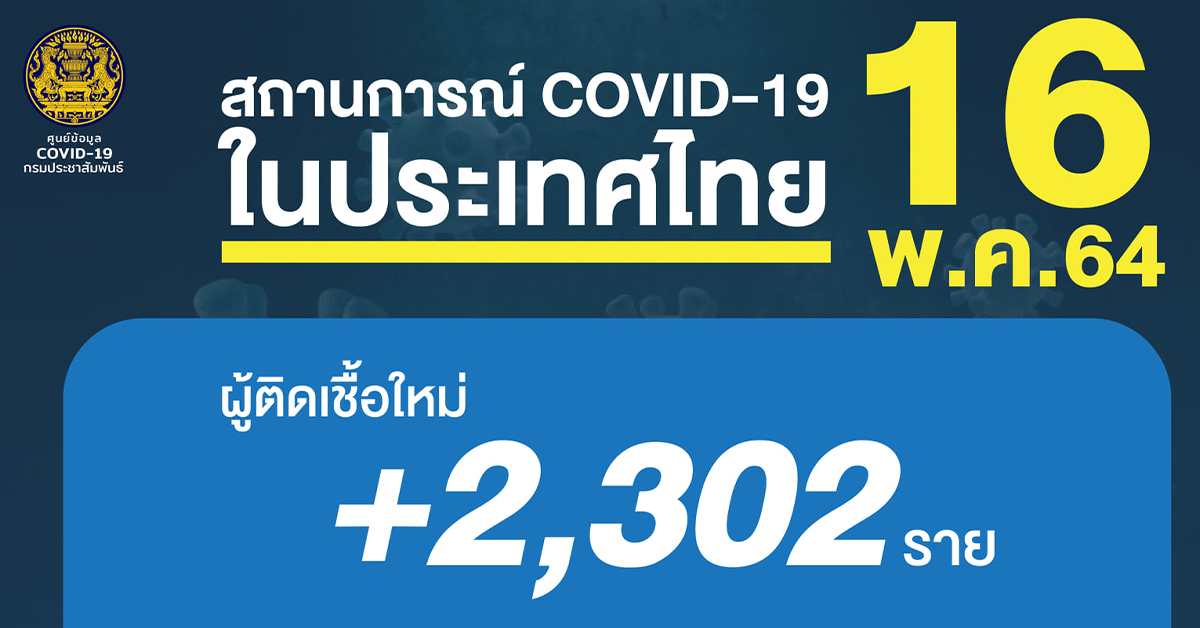 กรุงเทพฯ 16 พ.ค.-โควิดวันนี้ ยอดผู้ติดเชื้อใหม่ 2,302 ราย ยืนยันสะสม 72,584 ราย หายป่วยกลับบ้าน 2,136 ราย เสียชีวิต 24 ราย