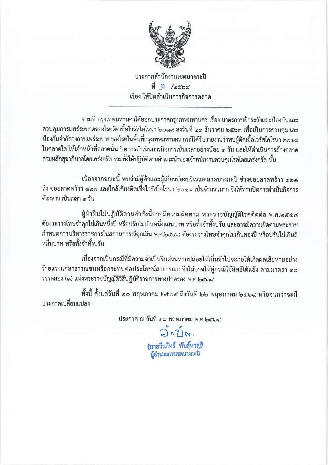 เพจเฟซบุ๊ก “สำนักงานเขตบางกะปิ” โพสต์ประกาศสำนักงานเขตบางกะปิ แจ้งปิดตลาดบางกะปิ 3 วัน ตั้งแต่วันที่ 20 -22 พ.ค.64 เนื่องจากพบว่ามีผู้ติดเชื้อไวรัสโควิด -19 บริเวณตลาดบางกะปิ ช่วงซอยลาดพร้าว 121 ถึงซอยลาดพร้าว 127 และใกล้เคียง เป็นจำนวนมาก เพื่อเป็นการป้องกันการแพร่ระบาดของโรค