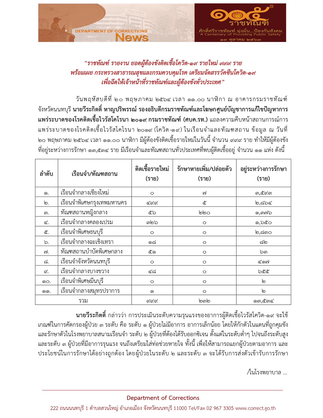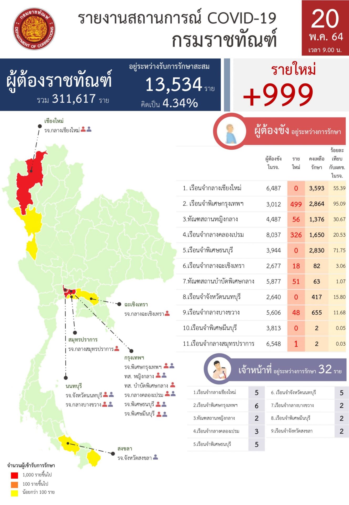 นพ.วีระกิตติ์ หาญปริพรรณ์ รองอธิบดีกรมราชทัณฑ์ กระทรวงยุติธรรมแถลงสถานการณ์ผู้ต้งขังติดเชื้อ ว่า ยอดผู้ต้องขังติดเชื้อเพิ่มวันนี้ (20พ.ค.) 999 ราย ทำให้มียอดผู้ต้องขังติดเชื้อรวม 13,534 ราย ในเรือนจำ 11 แห่ง ได้แก่ เรือนจำกลางเชียงใหม่ เรือนจำพิเศษกรุงเทพ ทัณฑสถานหญิงกลาง เรือนจำกลางคลองเปรม เรือนจำพิเศษธนบุรี เรือนจำกลางฉะเชิงเทรา ทัณฑสถานบำบัดกลาง เรือนจำจังหวัดนนทบุรี เรือนจำกลางบางขวาง เรือนจำพิเศษมีนบุรี