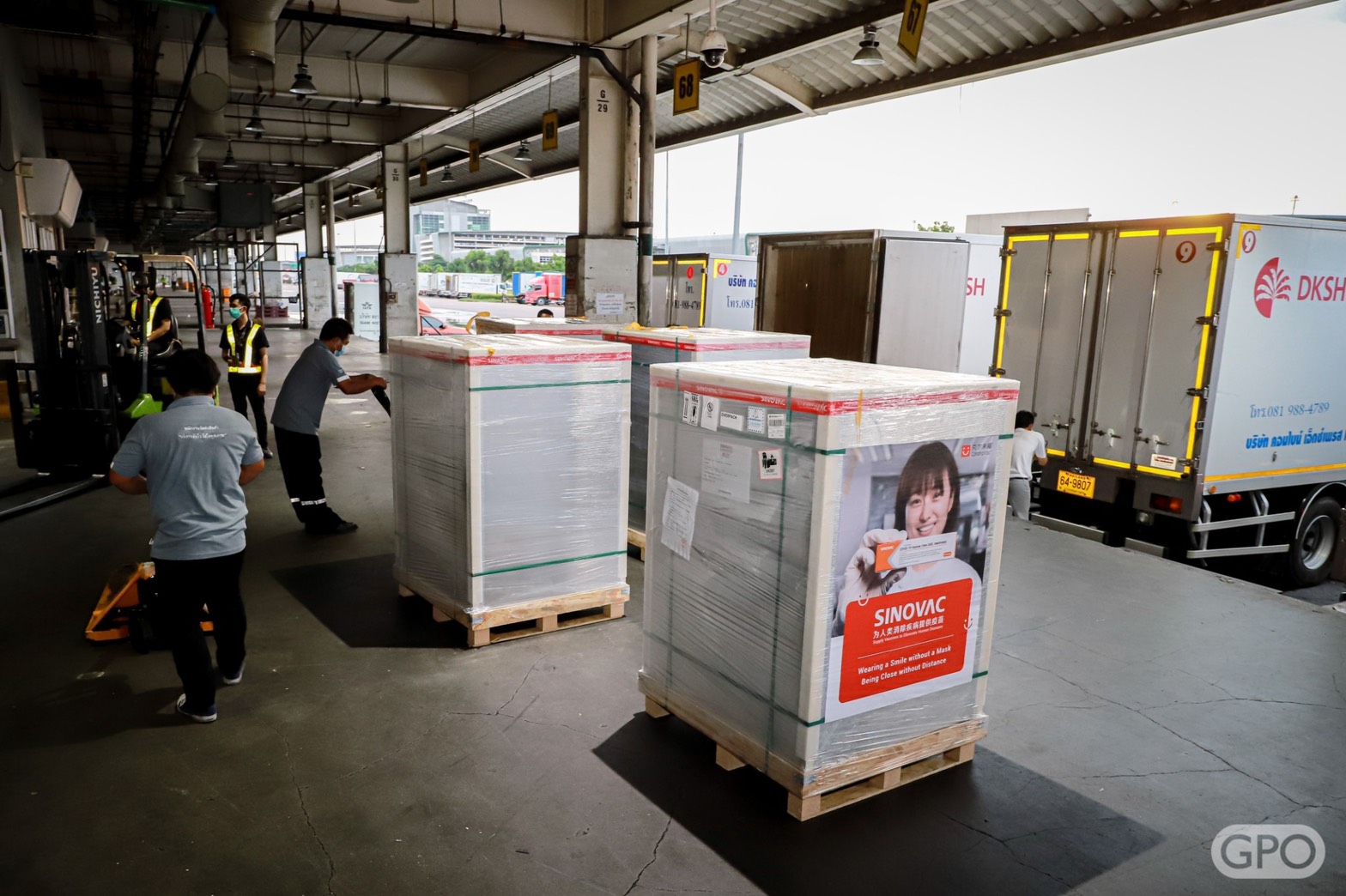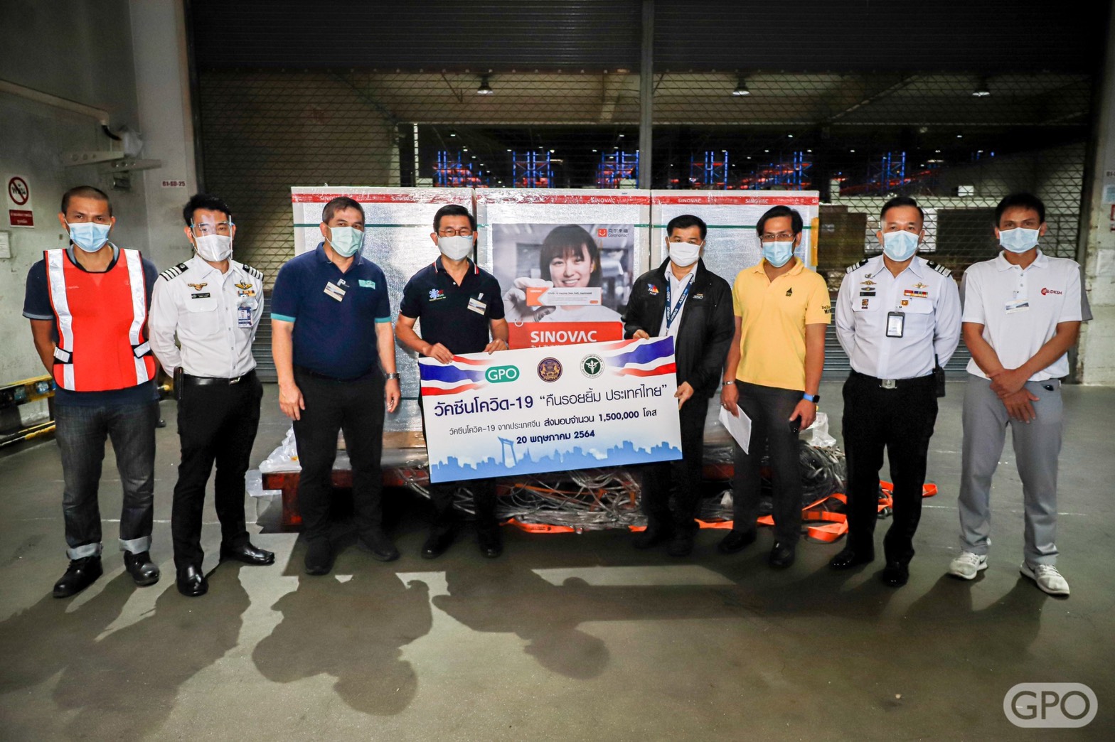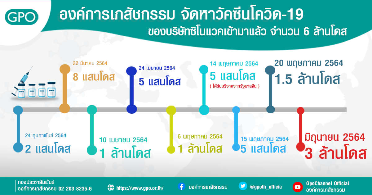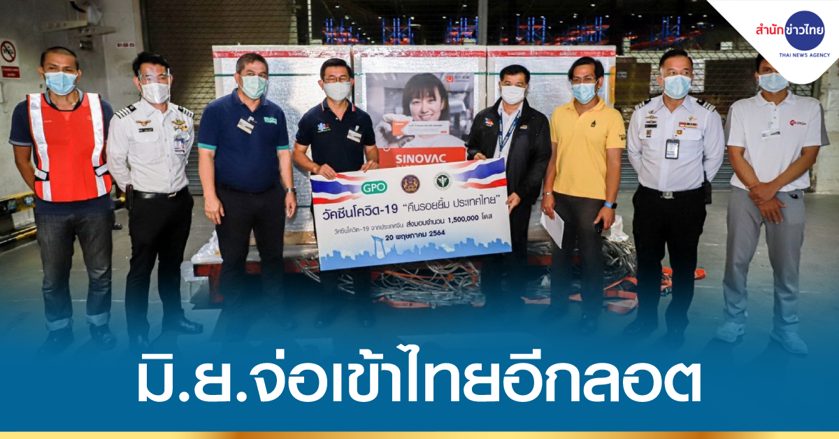 นพ.วิฑูรย์ ด่านวิบูลย์ ผู้อำนวยการองค์การเภสัชกรรม ให้สัมภาษณ์ว่า เช้าวันนี้ (20 พ.ค.) เวลา 05.35 น. ที่เขตปลอดอากรและคลังสินค้า ท่าอากาศยานสุวรรณภูมิ จังหวัดสมุทรปราการ องค์การเภสัชกรรม ได้รับมอบวัคซีนโควิด-19 ของซิโนแวค จากประเทศจีน เพิ่มอีก 1.5 ล้านโดส โดยก่อนหน้านี้ได้นำเข้าวัคซีนซิโนแวคมาแล้ว 8 ลอต ลอตแรกเมื่อวันที่ 24 กุมภาพันธ์ 2564 จำนวน 2 แสนโดส, วันที่ 22 มีนาคม 2564 จำนวน 8 แสนโดส, วันที่ 10 เมษายน 2564 จำนวน 1 ล้านโดส, วันที่ 24 เมษายน 2564 จำนวน 5 แสนโดส, วันที่ 6 พฤษภาคม 2564 จำนวน 1 ล้านโดส, วันที่ 14 พฤษภาคม 2564 เป็นวัคซีนที่ทางประเทศจีนบริจาค จำนวน 5 แสนโดส, วันที่ 15 พฤษภาคม 2564 จำนวน 5 แสนโดส และในวันนี้ 1.5 ล้านโดส รวมวัคซีนที่องค์การเภสัชกรรมจัดหาได้เข้ามาแล้วทั้งสิ้น 6 ล้านโดส และภายในเดือนมิถุนายนนี้ จะนำเข้ามาอีกจำนวน 3 ล้านโดส