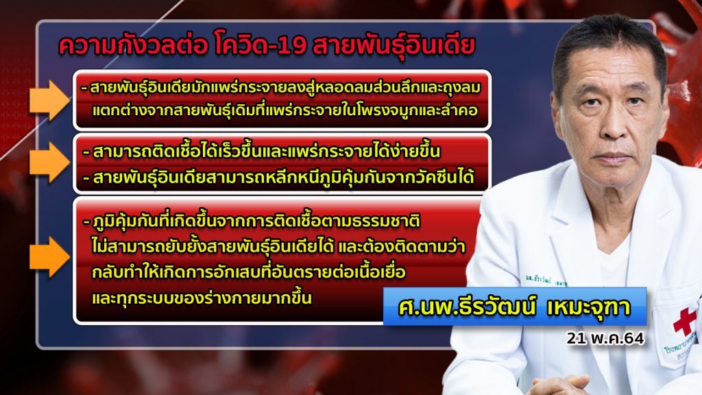 กรุงเทพฯ 21 พ.ค.-อธิบดีกรมควบคุมโรค เผยเชื้อโควิดสายพันธุ์อินเดีย แพร่เร็วไม่แตกต่างจากสายพันธุ์อังกฤษ และเชื้อรุนแรงขึ้น แต่ยังไม่ส่งผลกระทบต่อประสิทธิภาพของวัคซีน ทั้งแอสตราเซเนกา และซิโนแวค