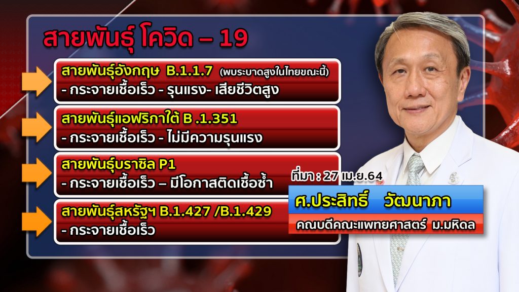 สำหรับสายพันธุ์โควิด-19 นพ.ประสิทธิ์ วัฒนาภา คณบดีคณะแพทยศาสตร์ศิริราชพยาบาล มหาวิทยาลัยมหิดล ได้ให้ข้อมูลไว้เมื่อวันที่ 27 เมษายน ว่าข้อมูลจากองค์การอนามัยโลก มีการพบกลายพันธุ์ของสายพันธุ์อังกฤษ เดือนกันยายนปีก่อน และเริ่มมีการกระจายไปในหลายประเทศ หลายทวีปทั่วโลก ในช่วงปลายเดือนกุมภาพันธ์ เดิมอัตราการป่วยเฉลี่ย 1 ล้านคน จะพบภายใน 2-3 วัน แต่ปัจจุบันเพิ่มมากขึ้น เฉลี่ยวันละ 8 แสนคนต่อวัน
