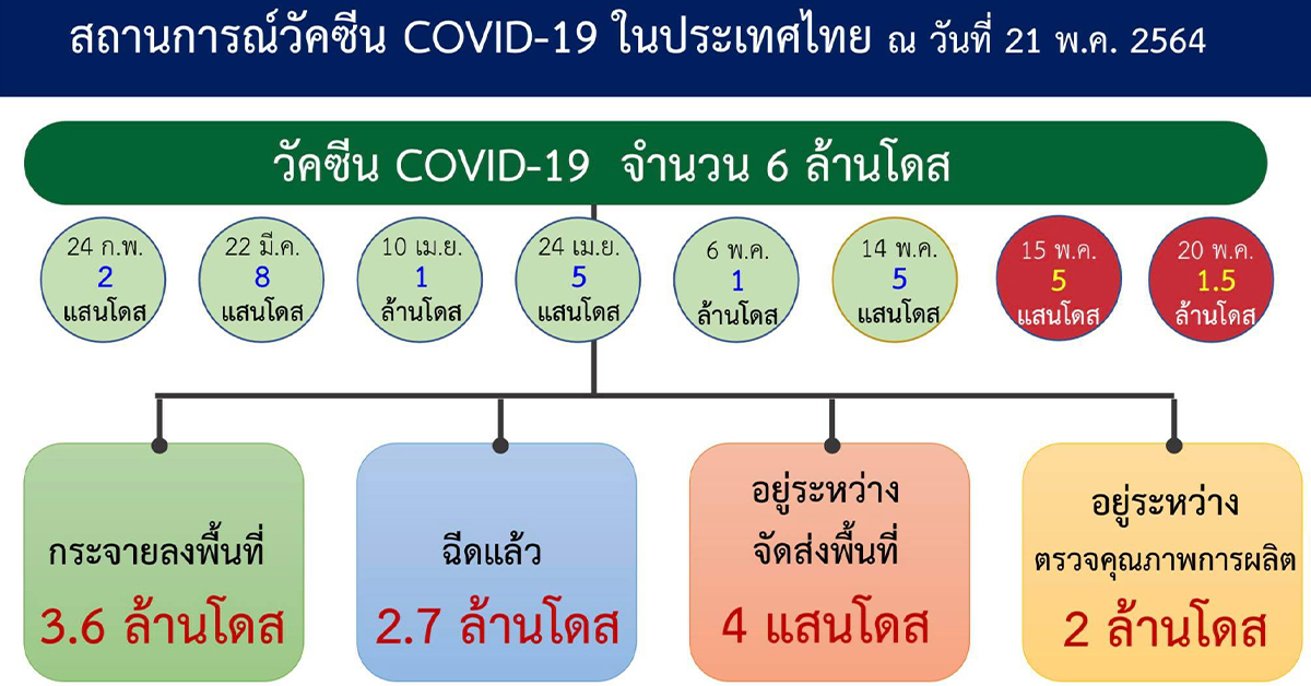 กรุงเทพฯ 22 พ.ค. – โฆษก ศบค.แจงวัคซีน 6 ล้านโดน กระจายลงพื้นที่แล้ว 3.6 ล้านโดน ส่วนอีก 2 ล้านโดสอยู่ระหว่างตรวจคุณภาพ