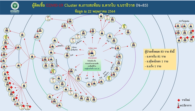นพ.โอภาส การย์กวินพงศ์ อธิบดีกรมควบคุมโรค แถลงสถานการณ์พบเชื้อสายพันธุ์ B.1.351.2 หรือสายพันธุ์แอฟริกาใต้ โดยกรมควบคุมโรคได้รับแจ้งจาการส่งตัวอย่างสุ่มตรวจที่คณะแพทยศาสตร์ โรงพยาบาลรามาธิบดี ทำให้ได้รับแจ้งว่า มีการพบสายพันธุ์แอฟริกาใต้ ที่คลัสเตอร์ต.เกาะสะท้อน อ.ตากใบ จ.นราธิวาส โดยเริ่มจากชายไทยอาย32ปี ไม่มีโรคประจำจัว แต่มีประวัติเสี่ยงจากภรรยาชาวมาเลเซีย เดินทางมาพร้อมมารดาของผํป่วยและบุตร ผ่านช่องทางธรรมชาติ เพื่อมาอยี่ยมและพักในประเทศไทย ช่วงวันที่12 เม.ย.-4พ.ค 2564 และได้เแนทางกลับประเทศมาเลเซียไปแล้ว โดยคลัสเตอร์ตากใบมีผู้ติดเชื้อเป็นกลุ่มก้อน 83 ราย โดยมีผู้ติดเชื้อสายพันธูแอฟริกาจำนวน 3 ราย โดยผู้ป่วยมีอาการไข้ ปวดเมื่อย ปวดท้อง ขณะนี้ทั้ง3รายที่ติดเชื้อ ได้หายจากโรคแล้ว และภรรยาชาวมาเลเซียและลูกเดินทางกลับไปมาเลเซียแล้ว ทั้งนี้เมื่อพบการระบาด ได้ปิดพื้นที่ ดำเนินมาตรการสาธารณสุขอย่างเข้มงวด ตั้งด่านตรวจที่หมู่บ้าน 4,7,8,9 ควบคุมการเข้าออก โดยคลัสเตอร์นี้ได้ตรวจเชิงรัก ผู้สัมผัสเสี่ยงสูง698ราย ค้นหาเชิงรุกในพื้นที่ 160ราย ขณะนี้สธ.และพื้นที่ได้ควบคุมสถานการณ์ได้แล้ว ไม่มีการติดเชื้อเพิ่มแล้ว