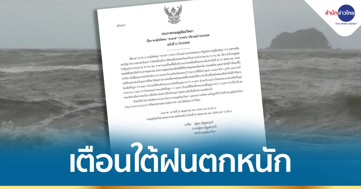 กรมอุตุนิยมวิทยา ออกประกาศเตือน “พายุไซโคลน “ยาอาส” (YAAS) บริเวณอ่าวเบงกอล ฉบับที่ 4 ลงวันที่ 25 พฤษภาคม 2564 เมื่อเวลา 01.00 น. พายุไซโคลน “ยาอาส” (YAAS) บริเวณอ่าวเบงกอลตอนบน มีศูนย์กลางอยู่ที่ละติจูด 17.6 องศาเหนือ ลองจิจูด 89.0 องศาตะวันออก กำลังเคลื่อนตัวทางทิศเหนือค่อนตะวันตกด้วยความเร็วประมาณ 10 กม./ชม. มีความเร็วลมสูงสุดใกล้ศูนย์กลางประมาณ 95 กม./ชม. คาดว่าจะเคลื่อนขึ้นฝั่งบริเวณประเทศอินเดียตอนบนในช่วงวันที่ 26-27 พฤษภาคม 2564