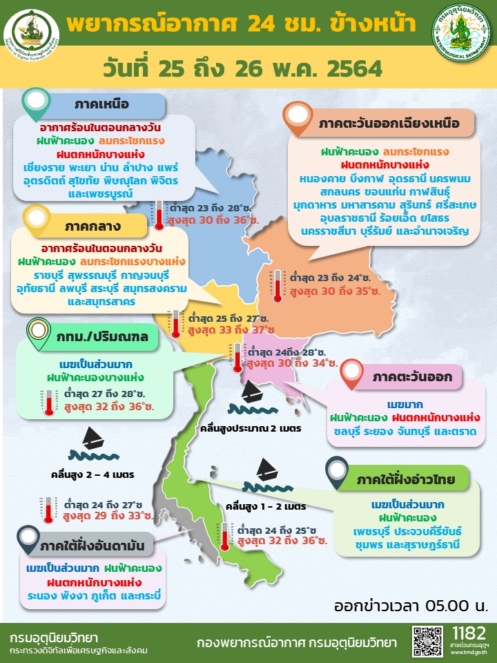 กรมอุตุนิยมวิทยา พยากรณ์อากาศ 24 ชั่วโมงข้างหน้า บริเวณประเทศไทยตอนบนมีฝนเพิ่มขึ้น และมีฝนตกหนักบางแห่งในภาคเหนือ ภาคตะวันออกเฉียงเหนือ และภาคตะวันออก เนื่องจากมีร่องมรสุมพาดผ่านภาคเหนือตอนล่าง และภาคตะวันออกเฉียงเหนือ ประกอบกับมรสุมตะวันตกเฉียงใต้ที่พัดปกคลุมทะเลอันดามัน ภาคใต้ และอ่าวไทย มีกำลังแรงขึ้น ทำให้ภาคใต้มีฝนตกหนักบางพื้นที่