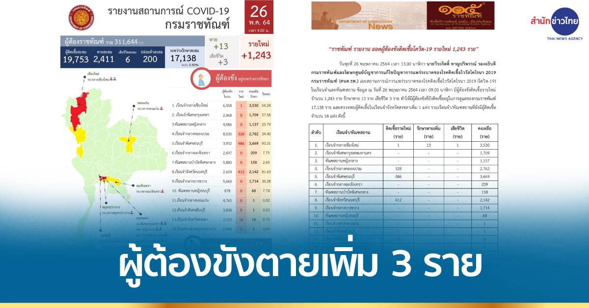 กทม. 26 พ.ค.-ราชทัณฑ์ รายงานยอดผู้ต้องขังติดเชื้อโควิด-19 รายใหม่ 1,243 ราย เสียชีวิตเพิ่ม 3 ราย และพบผู้ติดเชื้อในเรือนจำสงขลาเพิ่ม 1 แห่ง