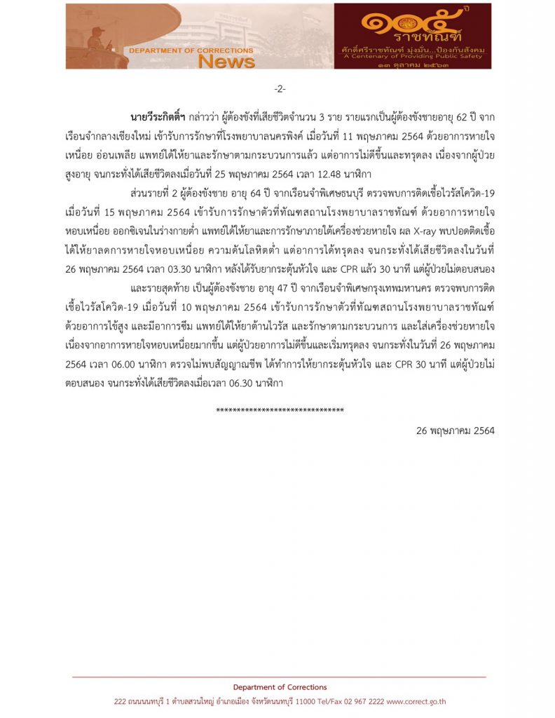 ส่วนรายที่ 2 ผู้ต้องขังชาย อายุ 64 ปี จากเรือนจำพิเศษธนบุรี ตรวจพบการติดเชื้อไวรัสโควิด-19 เมื่อวันที่ 15 พฤษภาคม 2564 เข้ารับการรักษาตัวที่ทัณฑสถานโรงพยาบาลราชทัณฑ์ ด้วยอาการหายใจหอบเหนื่อย ออกซิเจนในร่างกายต่ำ แพทย์ได้ให้ยาและการรักษาภายใต้เครื่องช่วยหายใจ ผล X-ray พบปอดติดเชื้อ ได้ให้ยาลดการหายใจหอบเหนื่อย ความดันโลหิตต่ำ แต่อาการได้ทรุดลง จนกระทั่งได้เสียชีวิตลงในวันที่ 26 พฤษภาคม 2564 เวลา 03.30 น. หลังได้รับยากระตุ้นหัวใจ และ CPR แล้ว 30 นาที แต่ผู้ป่วยไม่ตอบสนอง