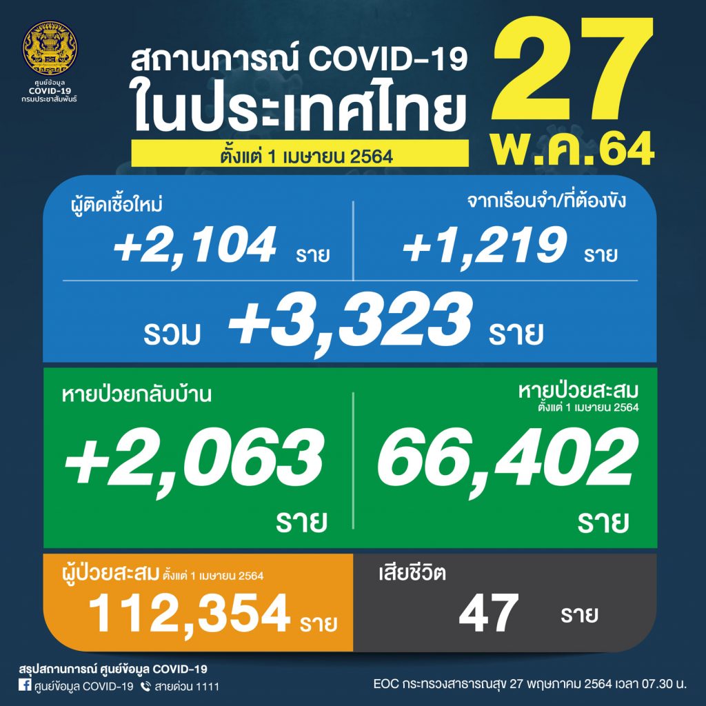 กรุงเทพฯ 27 พ.ค.-โควิดวันนี้ ยอดเสียชีวิตทำสถิตินิวไฮอีกครั้ง 47 ราย ติดเชื้ออีก 3,323 ราย ยืนยันสะสม 112,354 ราย (ตั้งแต่ 1 เมษายน) หายป่วยกลับบ้าน 2,063 ราย