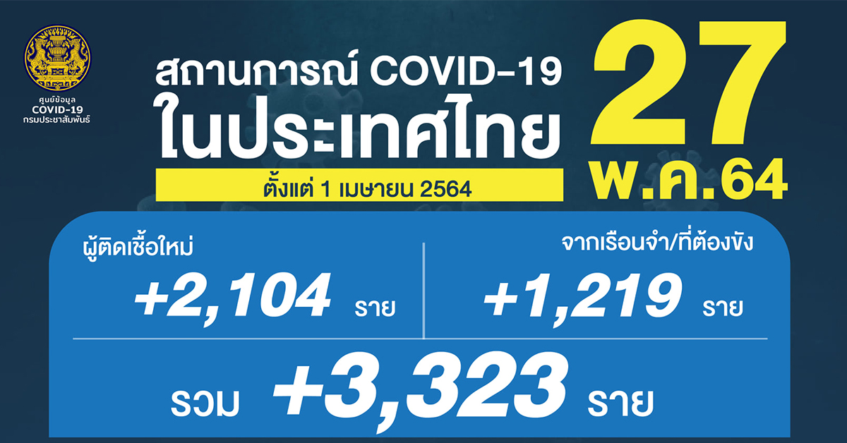 EOC กระทรวงสาธารณสุข รายงานสถานการณ์การติดเชื้อโควิด-19 รายใหม่ วันนี้ (27 พ.ค.) พบยอดผู้ติดเชื้อใหม่รวม 3,323 ราย จำแนกเป็นติดเชื้อใหม่ 2,104 ราย ติดเชื้อภายในเรือนจำ/ที่ต้องขัง 1,219 ราย ยืนยันสะสม 112,354 ราย (ตั้งแต่ 1 เมษายน) หายป่วยกลับบ้าน 2,063 ราย มีผู้เสียชีวิตเพิ่ม 47 ราย ทั้งนี้ เวลา 12.30 น. ศบค. จะแถลงรายละเอียดอย่างเป็นทางการอีกครั้ง .-สำนักข่าวไทย