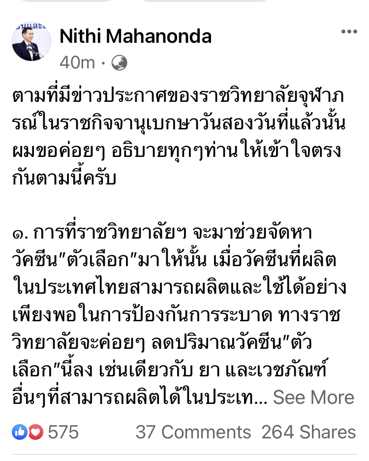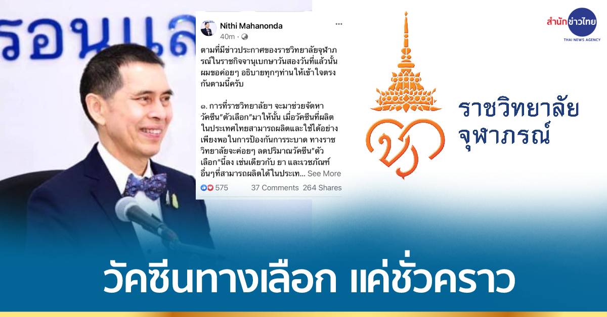กรุงเทพฯ 27 พ.ค.-นพ.นิธิ โพสต์เฟซบุ๊ก แจงประกาศราชวิทยาลัยจุฬาภรณ์ การจัดหาวัคซีนตัวเลือก ใช้ช่วงป้องกันการระบาด จะค่อยๆ ลดลงหากวัคซีนเพียงพอ ดำเนินการตามกฎหมายเกี่ยวกับการนำเข้า ขออนุญาตในภาวะฉุกเฉิน เป็นไปตามภารกิจ