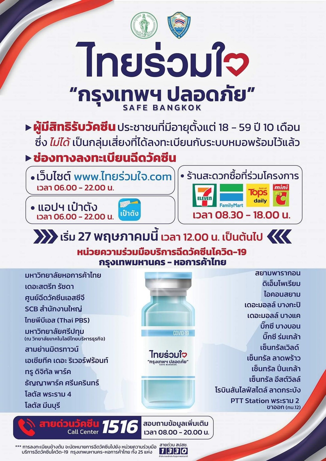 พล.ต.อ.อัศวิน ขวัญเมือง ผู้ว่าราชการกรุงเทพมหานคร (ผู้ว่าฯ กทม.) เปิดเผยว่า ภายหลังเปิดให้ประชาชนชาวกรุงเทพฯ จองรับบริการวัคซีนโควิด-19 วันแรก ผ่านโครงการ “ไทยร่วมใจ กรุงเทพฯ ปลอดภัย SAFE BANGKOK” 3 ช่องทางหลัก ได้แก่ เว็บไซต์ไทยร่วมใจดอทคอม แอปพลิเคชันเป๋าตัง และร้านสะดวกซื้อที่ร่วมโครงการ มีผู้สนใจจองการฉีดวัคซีนมากกว่า 1 ล้านคน โดยจะเข้ารับบริการวัคซีน ณ หน่วยบริการวัคซีนนอกโรงพยาบาล ซึ่ง กทม.ร่วมกับสภาหอการค้าแห่งประเทศไทย จัดตั้งขึ้น 25 แห่ง