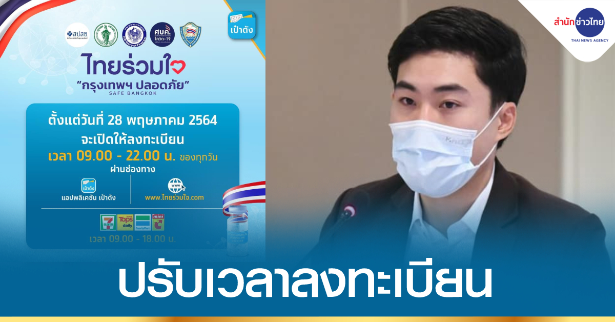 กรุงเทพฯ 27 พ.ค. – กทม.ปรับเวลาลงทะเบียนรับวัคซีนโควิด-19 ในโครงการ “ไทยร่วมใจ กรุงเทพฯ ปลอดภัย” เป็น 09.00-22.00 น. ส่วนยอดลงทะเบียนวันแรกทะลุ 1.2 ล้านคน