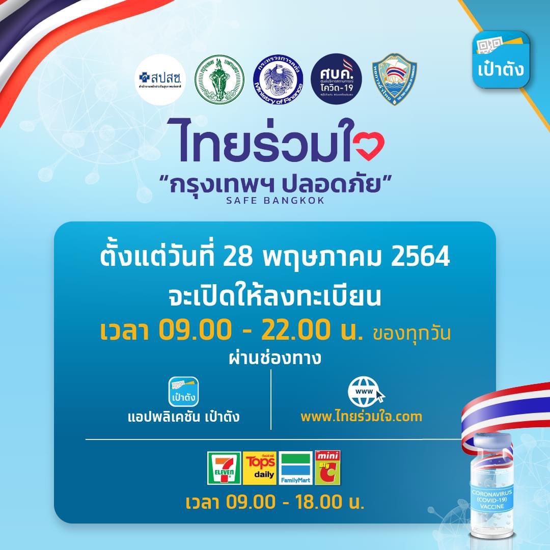 (27 พ.ค.64) ร.ต.อ.พงศกร ขวัญเมือง โฆษกของกรุงเทพมหานคร เปิดเผยว่า ตามที่กรุงเทพมหานครเปิดให้ประชาชนชาวกรุงเทพฯ ที่ประสงค์รับวัคซีนป้องกันโควิด-19 ลงทะเบียนภายใต้โครงการ “ไทยร่วมใจ กรุงเทพฯ ปลอดภัย” ตั้งแต่เวลา 12.00 น. วันที่ 27 พ.ค.64 ผ่านทาง 3 ช่องทางหลัก ได้แก่ เว็บไซต์ไทยร่วมใจดอทคอม แอปพลิเคชันเป๋าตัง และร้านสะดวกซื้อที่ร่วมโครงการ และจะให้บริการฉีดวัคซีน 7 มิ.ย.-ก.ค.64