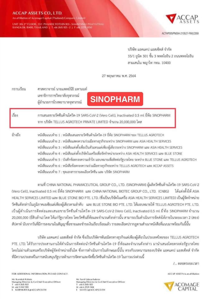 ด้าน นพ.ไพศาล ดั่นคุ้ม เลขาธิการคณะกรรมการอาหารและยา (อย.) กล่าวถึงกรณีมีการเผยแพร่เอกสาร ว่าบริษัทแอคแคป แอสเซ็ทส์ จำกัด (ACCAP ASSETS) ระบุว่ามีวัคซีนซิโนฟาร์ม 20 ล้านโดสเสนอให้รัฐบาลไทย แต่ พล.อ.ประยุทธ์ จันทร์โอชา นายกรัฐมนตรี และรัฐมนตรีว่าการกระทรวงกลาโหม รวมถึงนายอนุทิน ชาญวีรกูล รองนายกรัฐมนตรีและรัฐมนตรีว่าการกระทรวงสาธารณสุขแต่ไม่ให้เข้าพบจึงได้ไปเสนอขายให้กับราชวิทยาลัยจุฬาภรณ์ ว่า จากการตรวจสอบ 1.บริษัทแอคแคป แอสเซ็ทส์ จำกัด ไม่ได้เป็นผู้รับอนุญาตนำเข้าด้านยา และ 2.บริษัทแอคแคป แอสเซ็ทส์ จำกัด ไม่ได้มาขึ้นทะเบียนนำเข้าวัคซีน ป้องกันโควิด-19 ของซิโนฟาร์ม แต่บริษัทที่มาขอขึ้นทะเบียนนำเข้าวัคซีนฟาร์มคือบริษัท ไบโอจีนีเทค จำกัด