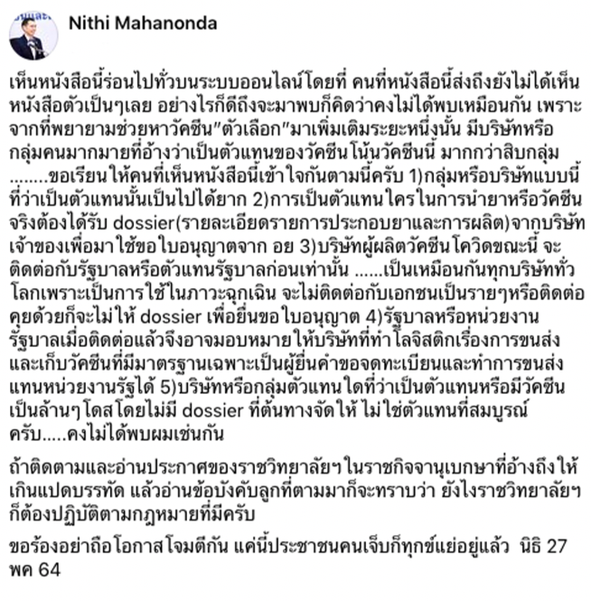 กรุงเทพฯ 28 พ.ค.-“หมอนิธิ”เลขาฯราชวิทยาลัยจุฬาภรณ์ โพสต์ยังไม่เคยเห็นหนังสือของบริษัทที่อ้างเป็นตัวแทนนำเข้าวัคซีนเสนอขาย “ซิโนฟาร์ม” ให้ 20 ล้านโดส พร้อมยก 5 เหตุผลชี้แจง ด้านเลขาฯ อย.แจงไม่มีชื่อบริษัทดังกล่าวยื่นขึ้นทะเบียนนำเข้าวัคซีนซิโนฟาร์ม มีแต่บริษัท ไบโอจีนีเทค เป็นผู้ขออนุญาต และวันนี้พิจารณา ขั้นตอนสุดท้าย