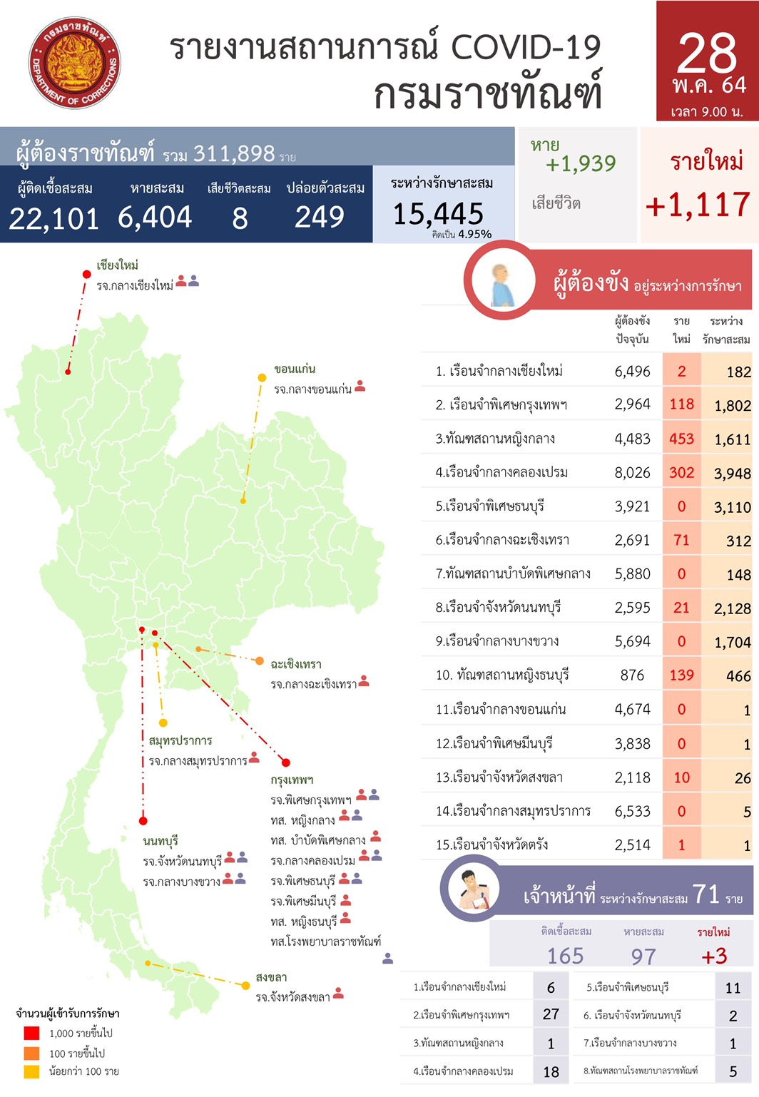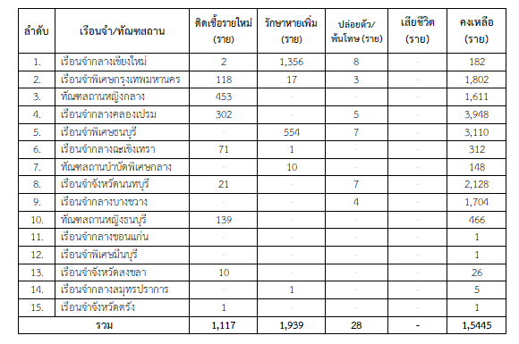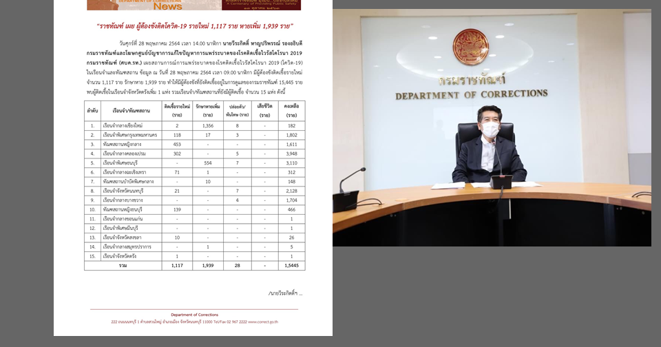 กรมราชทัณฑ์ 28 พ.ค.-กรมราชทัณฑ์ เผยผู้ต้องขังติดเชื้อโควิด-19 รายใหม่ จำนวน 1,117 ราย ขณะที่หายเพิ่ม 1,939 ราย