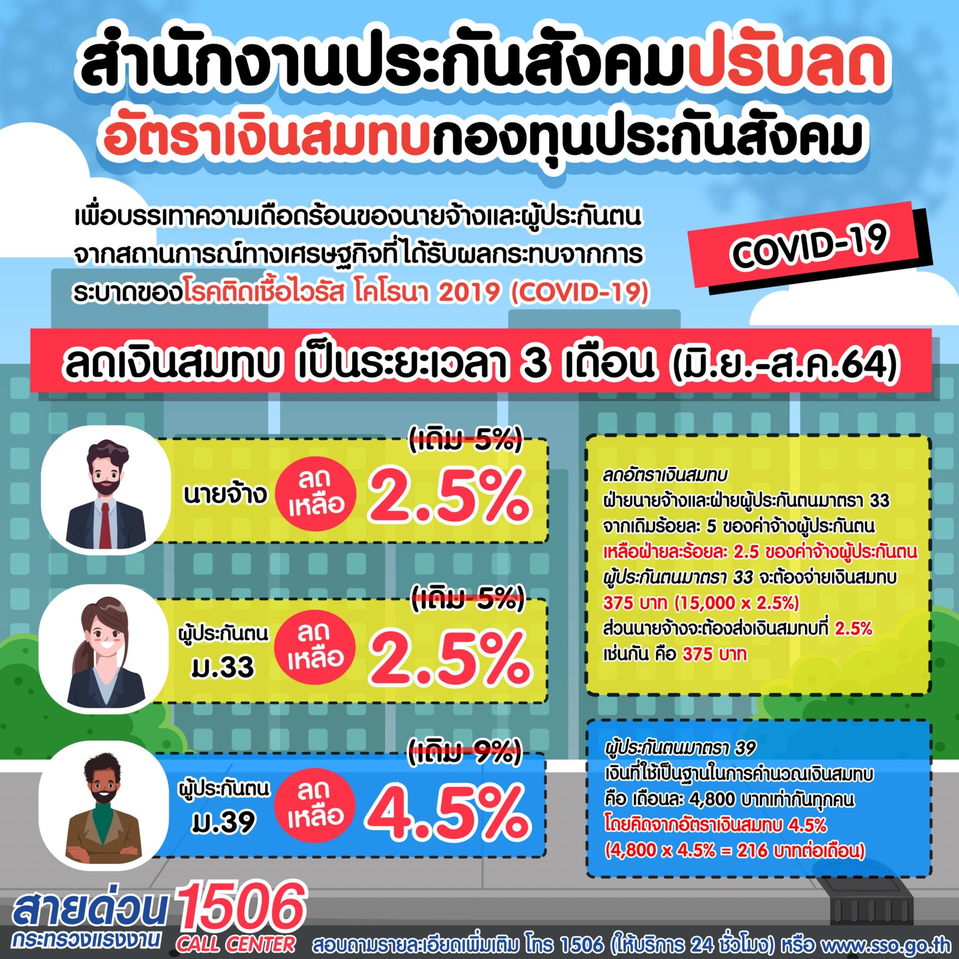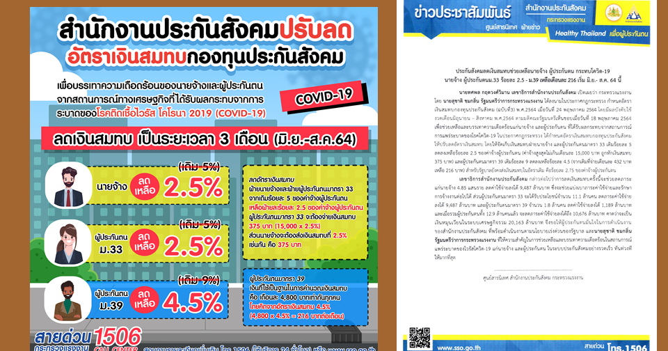 นายทศพล กฤตวงศ์วิมาน เลขาธิการสำนักงานประกันสังคม เปิดเผยว่า กระทรวงแรงงาน โดยนายสุชาติ ชมกลิ่น รัฐมนตรีว่าการกระทรวงแรงงาน ได้ลงนามในประกาศกฎกระทรวง กำหนดอัตราเงินสมทบกองทุนประกันสังคม (ฉบับที่ 3) พ.ศ. 2564 เมื่อวันที่ 24 พฤษภาคม 2564 โดยมีผลบังคับใช้ งวดเดือนมิถุนายน – สิงหาคม พ.ศ. 2564 ตามมติคณะรัฐมนตรีเห็นชอบเมื่อวันที่ 18 พฤษภาคม 2564 เพื่อช่วยเหลือและบรรเทาความเดือดร้อนแก่นายจ้าง และผู้ประกันตน ที่ได้รับผลกระทบจากสถานการณ์การแพร่ระบาดของโรคโควิด-19 ในประกาศกฎกระทรวงได้กำหนดอัตราเงินสมทบกองทุนประกันสังคม ให้ปรับลดอัตราเงินสมทบ โดยให้จัดเก็บเงินสมทบฝ่ายนายจ้าง และผู้ประกันตน มาตรา 33 เดิมร้อยละ 5 ลดลงเหลือร้อยละ 2.5 ของค่าจ้างผู้ประกันตน (ค่าจ้างสูงสุดไม่เกินเดือนละ 15,000 บาท ถูกหักเงินสมทบ 375 บาท) และผู้ประกันตน มาตรา 39 เดิมร้อยละ 9 ลดลงเหลือร้อยละ 4.5 (จากเดิมที่จ่ายเดือนละ 432 บาท เหลือ 216 บาท) สำหรับรัฐบาลยังคงส่งเงินสมทบในอัตราเดิม คือ ร้อยละ 2.75 ของค่าจ้างผู้ประกันตน