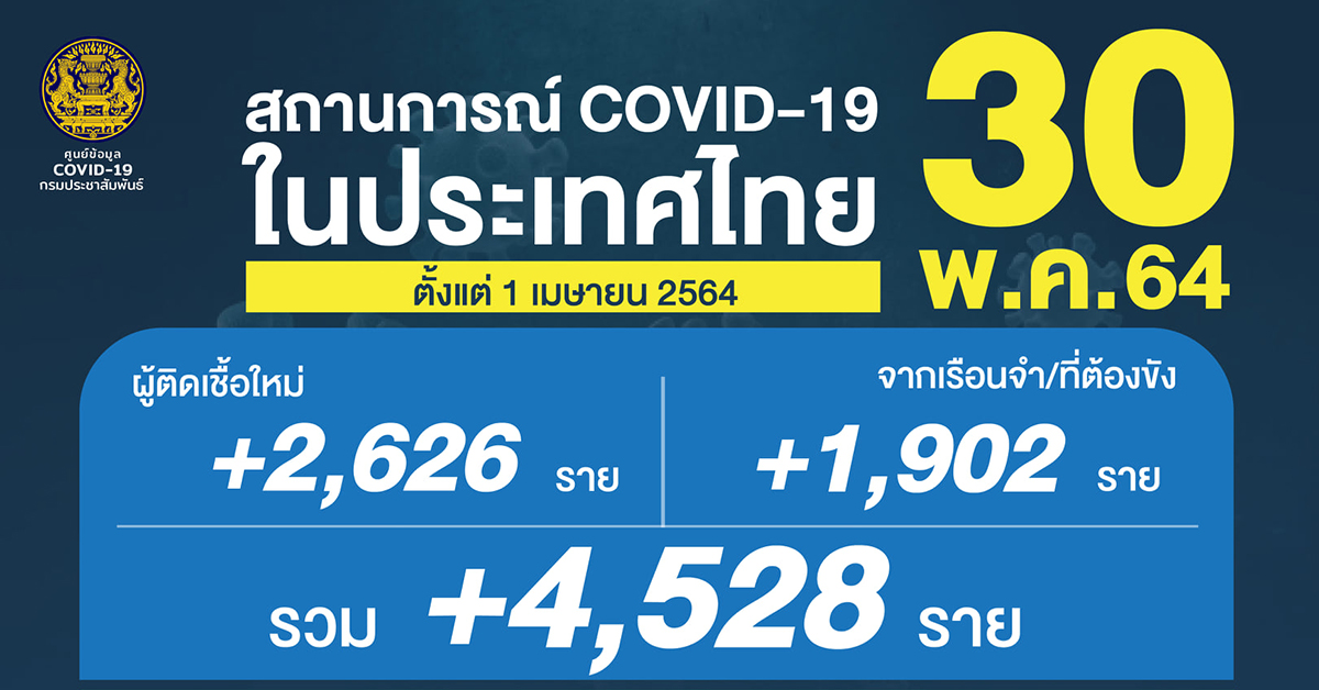 EOC กระทรวงสาธารณสุข รายงานสถานการณ์การติดเชื้อโควิด-19 รายใหม่ วันนี้ (30 พ.ค.) พบยอดผู้ติดเชื้อใหม่รวม 4,528 ราย จำแนกเป็นติดเชื้อใหม่ 2,626 ราย ติดเชื้อภายในเรือนจำ/ที่ต้องขัง 1,902 ราย ยืนยันสะสม 125,444 ราย (ตั้งแต่ 1 เมษายน) หายป่วยกลับบ้าน 2,933 ราย มีผู้เสียชีวิตเพิ่ม 24 ราย ทั้งนี้ เวลา 12.30 น. ศบค. จะแถลงรายละเอียดอย่างเป็นทางการอีกครั้ง .-สำนักข่าวไทย