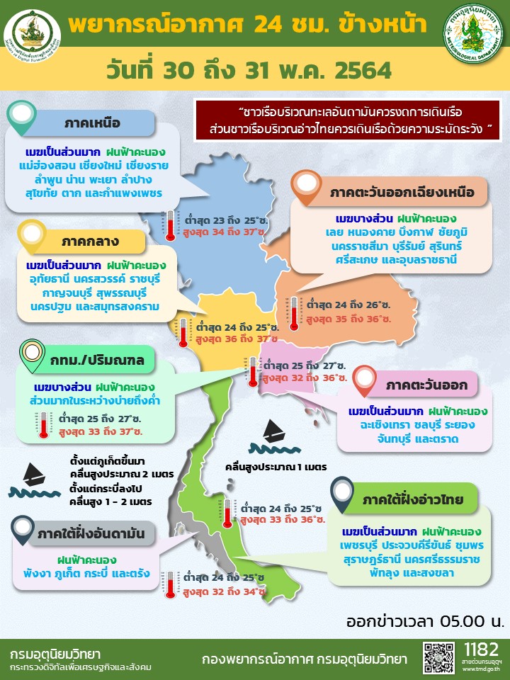 กรมอุตุนิยมวิทยา พยากรณ์อากาศ 24 ชั่วโมงข้างหน้า มรสุมตะวันตกเฉียงใต้กำลังปานกลางพัดปกคลุมทะเลอันดามัน ภาคใต้ และอ่าวไทย ทำให้บริเวณประเทศไทยมีฝนฟ้าคะนองเกิดขึ้นบางพื้นที่ สำหรับคลื่นลมบริเวณทะเลอันดามันตอนบนมีกำลังปานกลาง โดยตั้งแต่จังหวัดภูเก็ตขึ้นมาทะเลมีคลื่นสูงประมาณ 2 เมตร และบริเวณที่มีฝนฟ้าคะนองคลื่นสูงมากกว่า 2 เมตร ขอให้ชาวเรือบริเวณทะเลอันดามันเดินเรือด้วยความระมัดระวัง และชาวเรือบริเวณทะเลอันดามันตอนบนควรเดินเรือด้วยความระมัดระวังและหลีกเลี่ยงบริเวณที่มีฝนฟ้าคะนอง