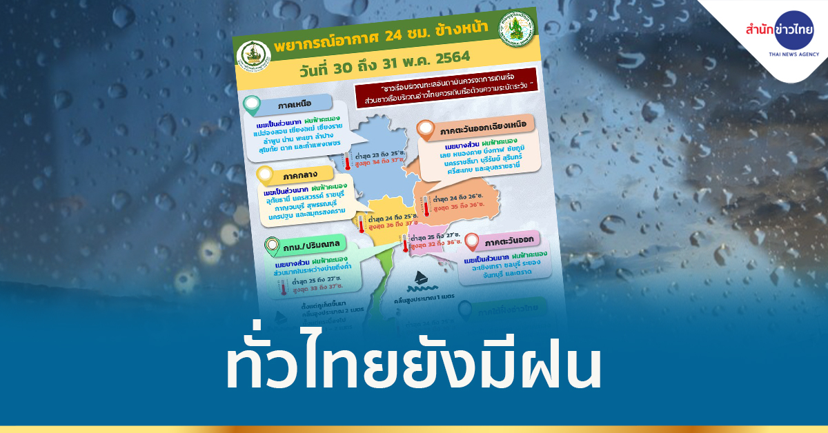 กรุงเทพฯ 30 พ.ค.-กรมอุตุนิยมวิทยาเตือนทั่วไทยยังมีฝนฟ้าคะนองบางพื้นที่ กทม.-ปริมณฑล ฝนร้อยละ 20 ส่วนมากช่วงบ่ายถึงค่ำ ภาคใต้ระวังคลื่นสูงกว่า 2 เมตร