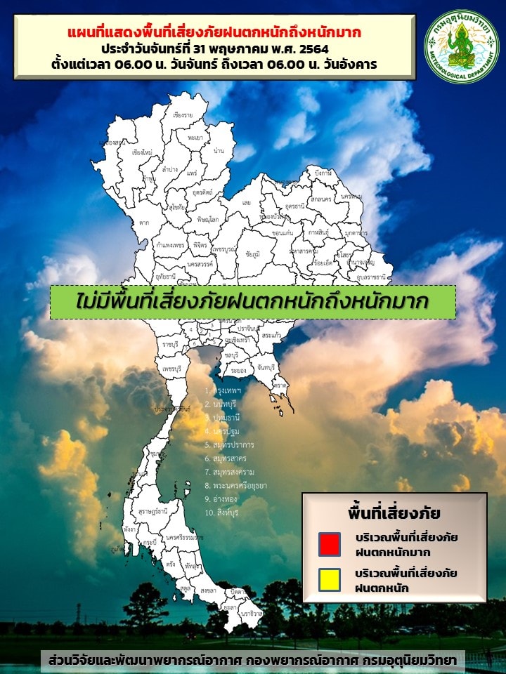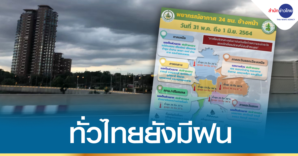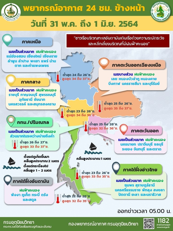 กรมอุตุฯ 31 พ.ค. – กรมอุตุฯ เผยทั่วไทยยังคงมีฝนฟ้าคะนองในระยะนี้ โดยกรุงเทพฯ-ปริมณฑล ฝนฟ้าคะนอง 10% ของพื้นที่ ในช่วงบ่ายถึงค่ำ ส่วนทะเลอันดามันตอนบน บริเวณที่มีฝนฟ้าคะนอง คลื่นสูงกว่า 2 เมตร