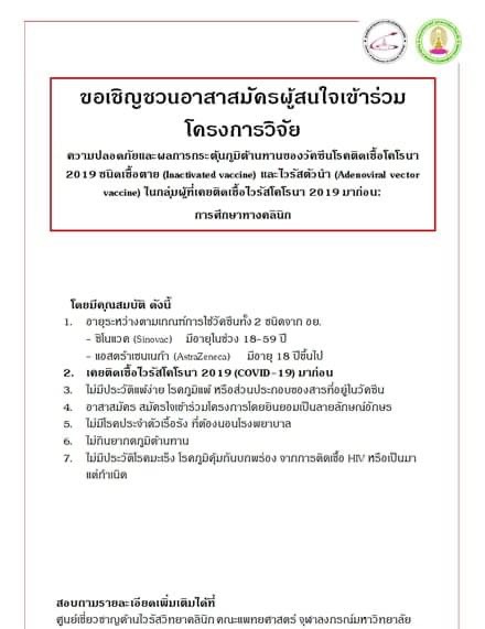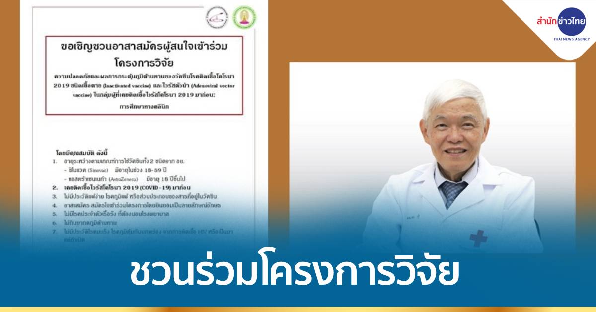 ศ.นพ.ยง ภู่วรวรรณ หรือ“หมอยง” หัวหน้าศูนย์เชี่ยวชาญเฉพาะทางด้านไวรัสวิทยาคลินิก ภาควิชากุมารเวชศาสตร์ คณะแพทยศาสตร์ จุฬาลงกรณ์มหาวิทยาลัย โพสต์เฟซบุ๊ก Yong Poovorawan เชิญชวนเข้าร่วมโครงการให้วัคซีนโควิด-19 ในผู้ที่เคยติดเชื้อไวรัสโควิด-19