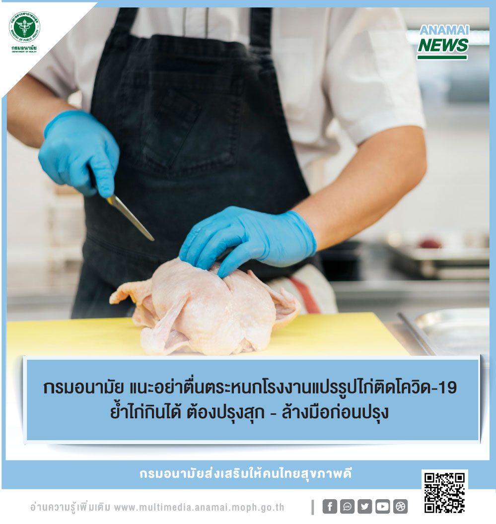 นายแพทย์สุวรรณชัย วัฒนายิ่งเจริญชัย อธิบดีกรมอนามัย เปิดเผยว่า จากกรณีการระบาดของโควิด-19 ภายในโรงงานแปรรูปเนื้อไก่สระบุรีข้อมูล ณ วันที่ 30 พฤษภาคม 2564 ทางสำนักงานสาธารณสุขจังหวัดสระบุรีได้ ดำเนินการตรวจค้นหาผู้ป่วยเชิงรุกพนักงานโรงงานแปรรูปเนื้อไก่สระบุรี ซึ่งมีพนักงานรวมทั้งสิ้นจำนวน 5,862 คน ได้ตรวจเชิงรุกแล้วจำนวน 3,400 คน ทราบผลการตรวจแล้ว จำนวน 2,299 คน พบผู้ติดเชื้อจำนวน 391 คน ส่งผลให้ประชาชนบางกลุ่มมีความวิตกกังวลต่อการบริโภคเนื้อไก่ในช่วงนี้ ซึ่งที่ผ่านมาข้อมูลขององค์การอนามัยโลกยังไม่พบหลักฐานที่แสดงว่ากระบวนการปรุงประกอบทําให้มีการแพร่เชื้อโควิด-19 ส่วนข้อมูล ขององค์การอาหารและยาของสหรัฐอเมริกา ระบุว่าความเสี่ยงจากการติดเชื้อผ่านทางอาหารและภาชนะบรรจุอาหารนั้นมีค่อนข้างต่ำ แม้ว่าจะมีรายงานพบผู้ป่วยจากโรงงานหรือสถานประกอบการผลิตอาหาร แต่ยังไม่มีหลักฐานแสดงว่าเชื้อไวรัสผ่านมาถึงผู้บริโภคโดยผ่านอาหาร หรือบรรจุภัณฑ์จากโรงงานที่มีคนงานติดเชื้อ